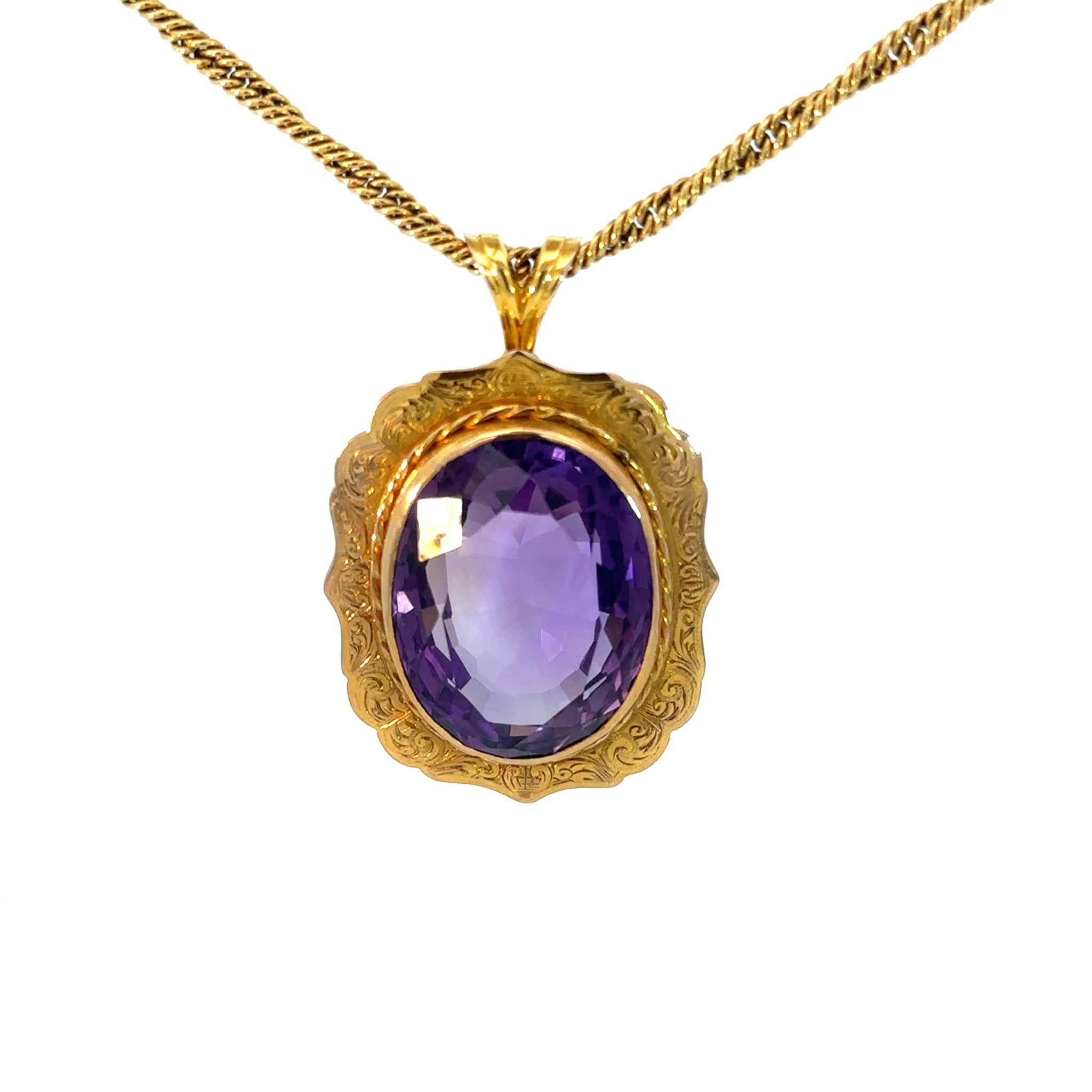 Stunning Amethyst pendant with a boarder of 9ct Yellow Gold. Stone is in an oval cut, and the gold halo is flat with engraved designs on one side. Has a gold bail to put through a necklace chain.