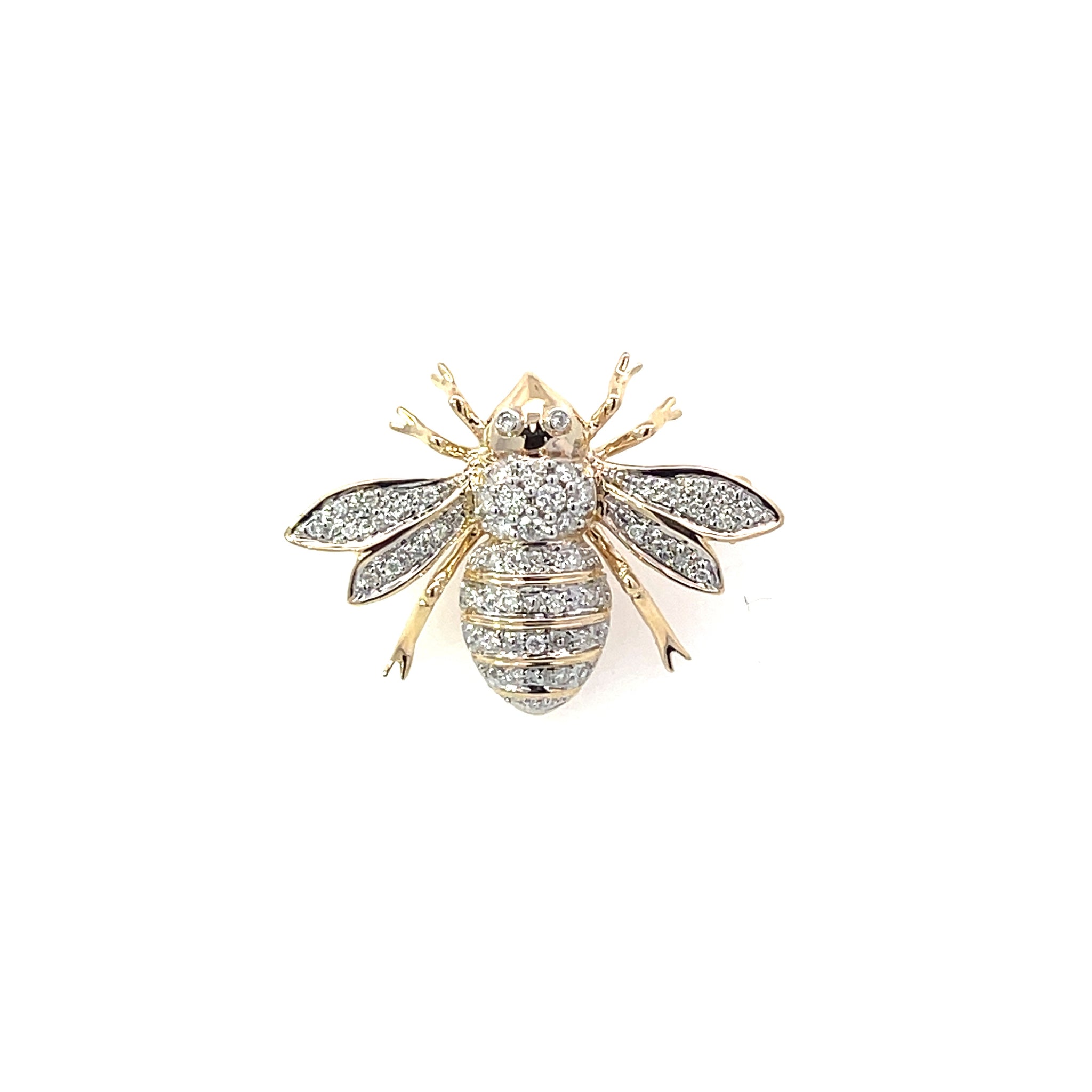 This beautiful diamond bee brooch is set in 14ct yellow gold.It has a loop at the top that can be worn as a pendant as well. There is a varied range of styles in our stunning bee brooch range. Enquire instore for other options available.