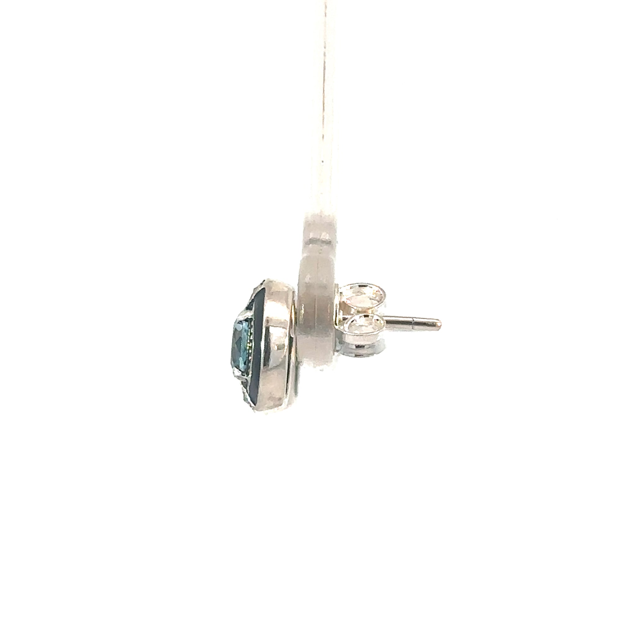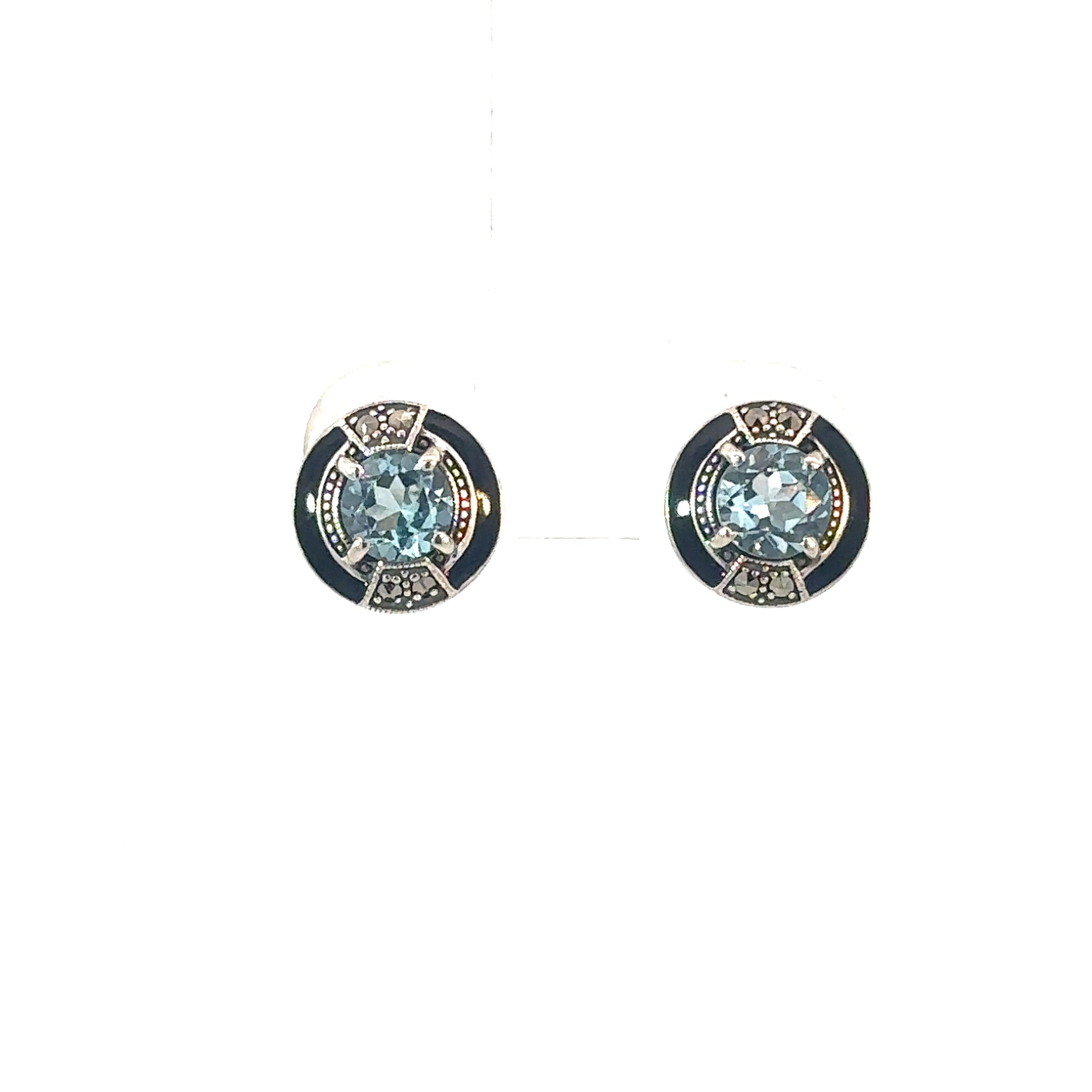 Antique Style Blue Topaz Enamel Stud Earrings with marcasite set in sterling silver. Post and butterfly scrolls.
