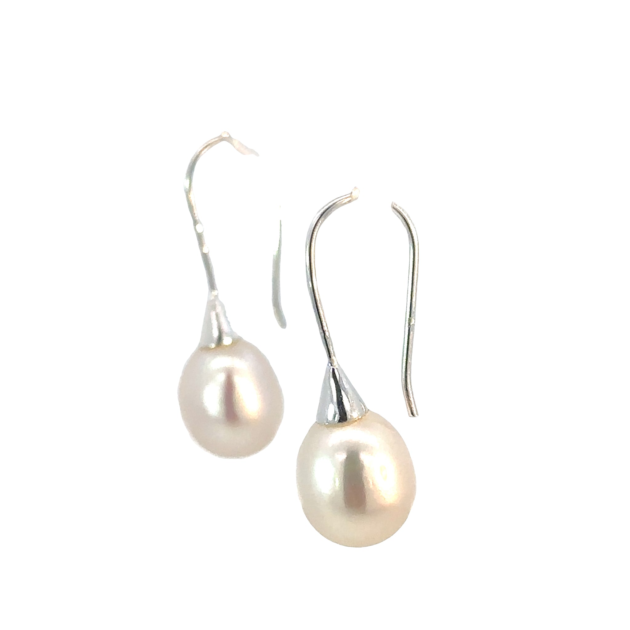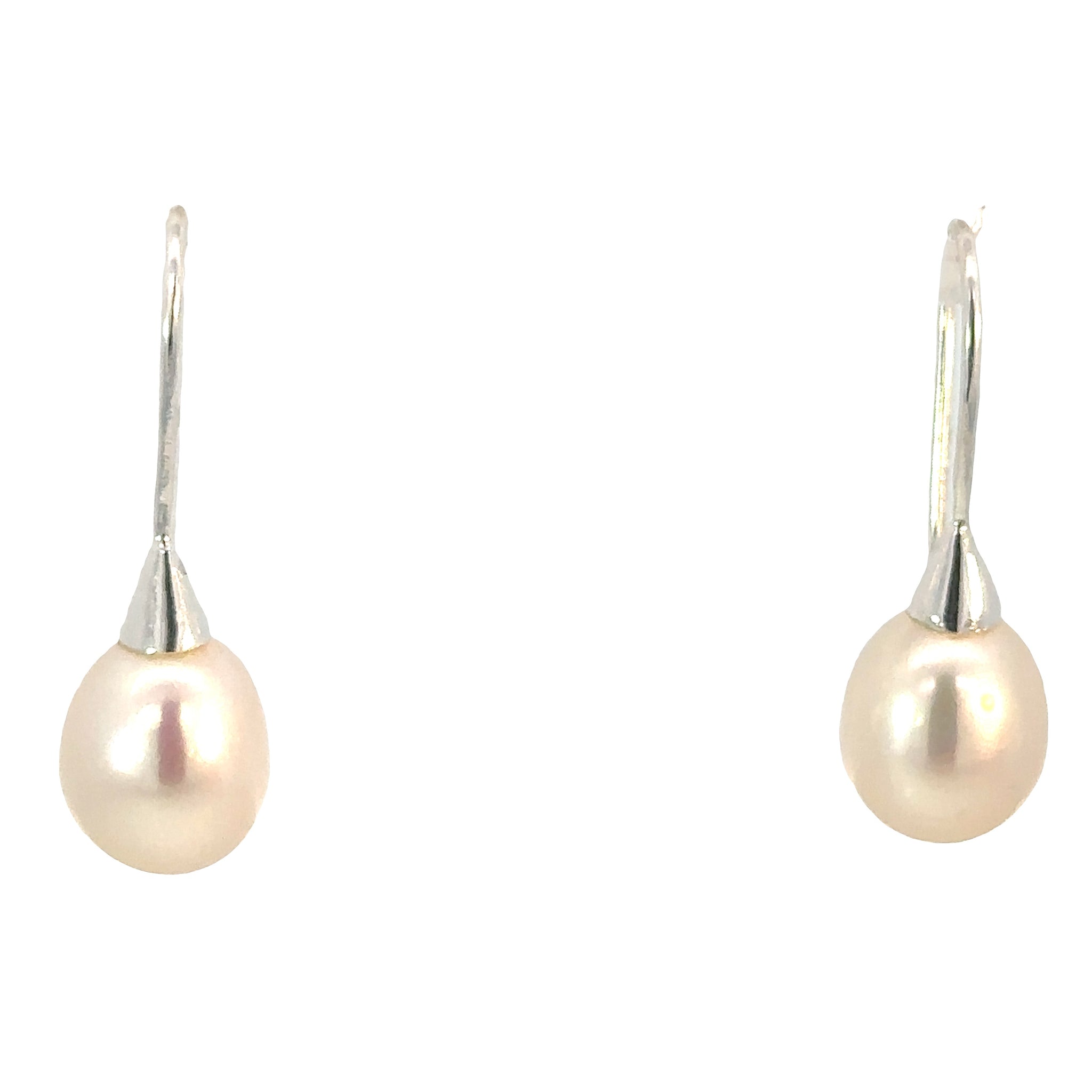 Oval Freshwater Pearl Drop Earrings on french hooks in sterling silver.