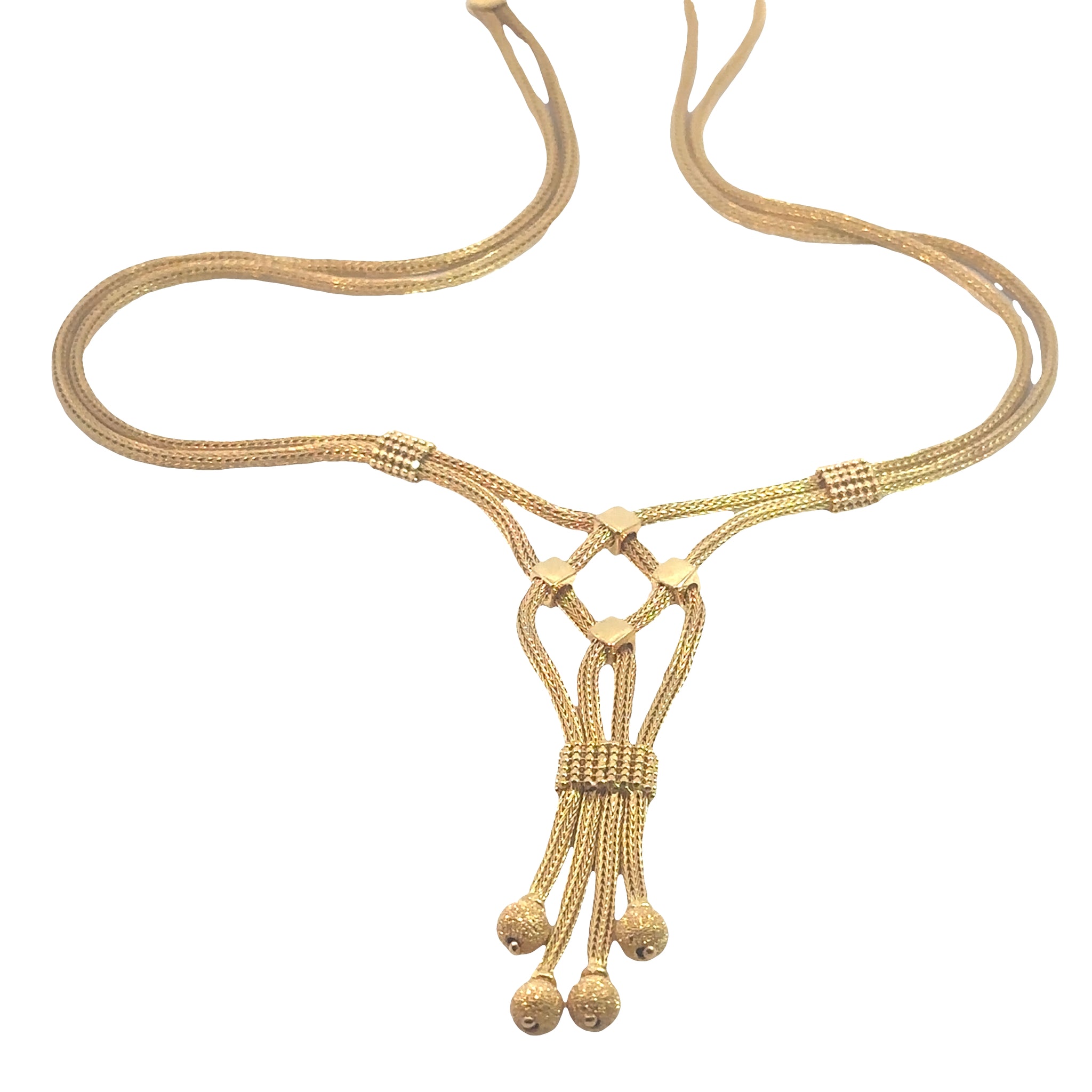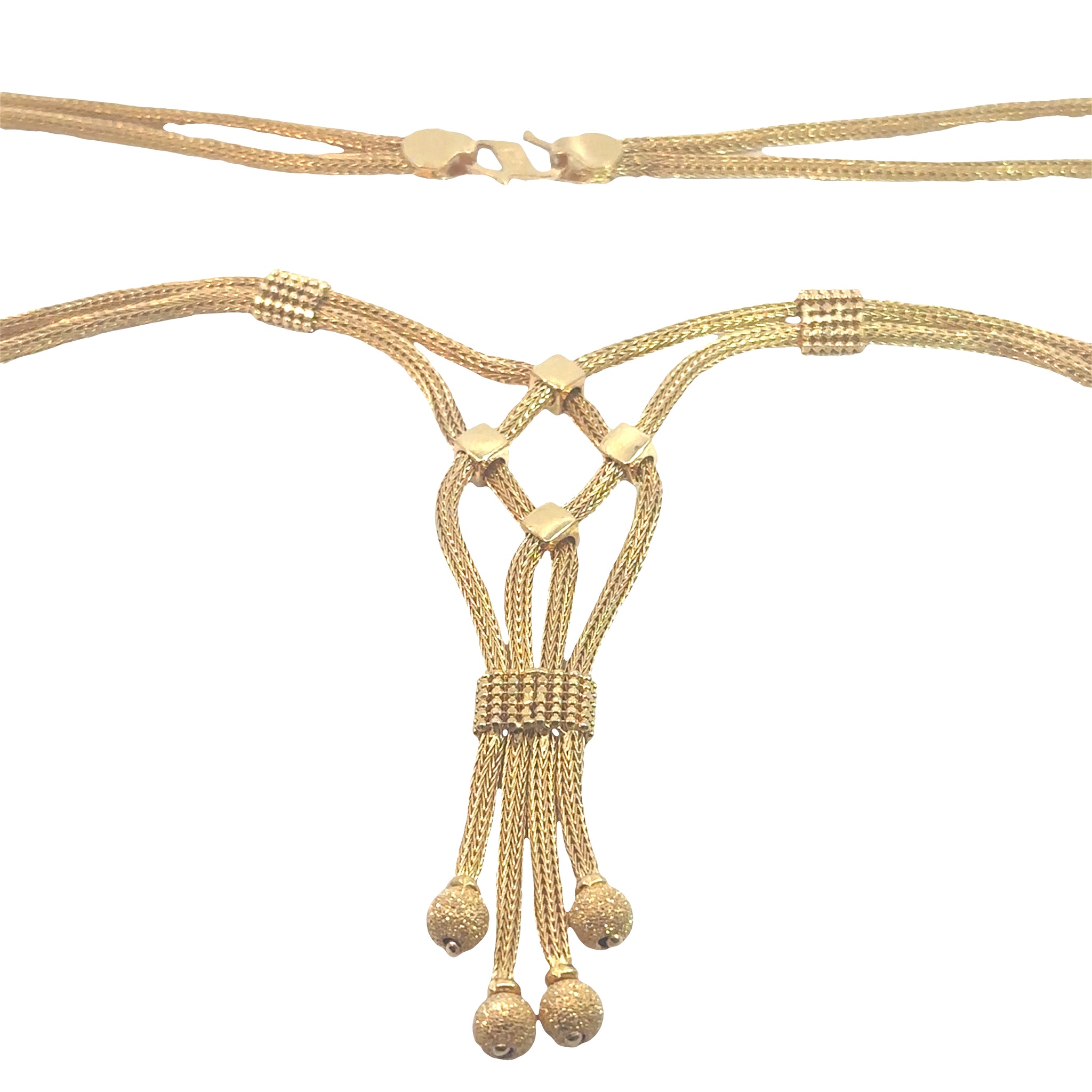 Bespoke 22ct Yellow Gold choker necklace. Made from wheatsheaf/snake link chain with square links designed in a diamond shape with four glitter finish balls on the end of the tassels.  Double thickness chain with cap ends and a 'S' clasp.  There are matching earrings available. Stamped 916 RD. Made in Dubai.