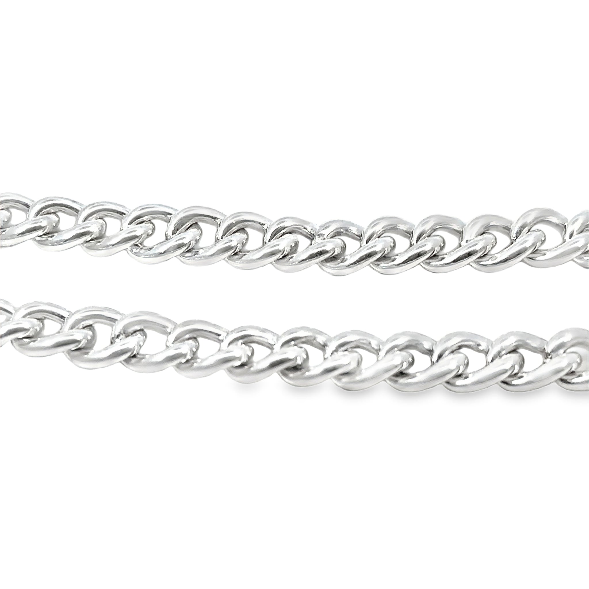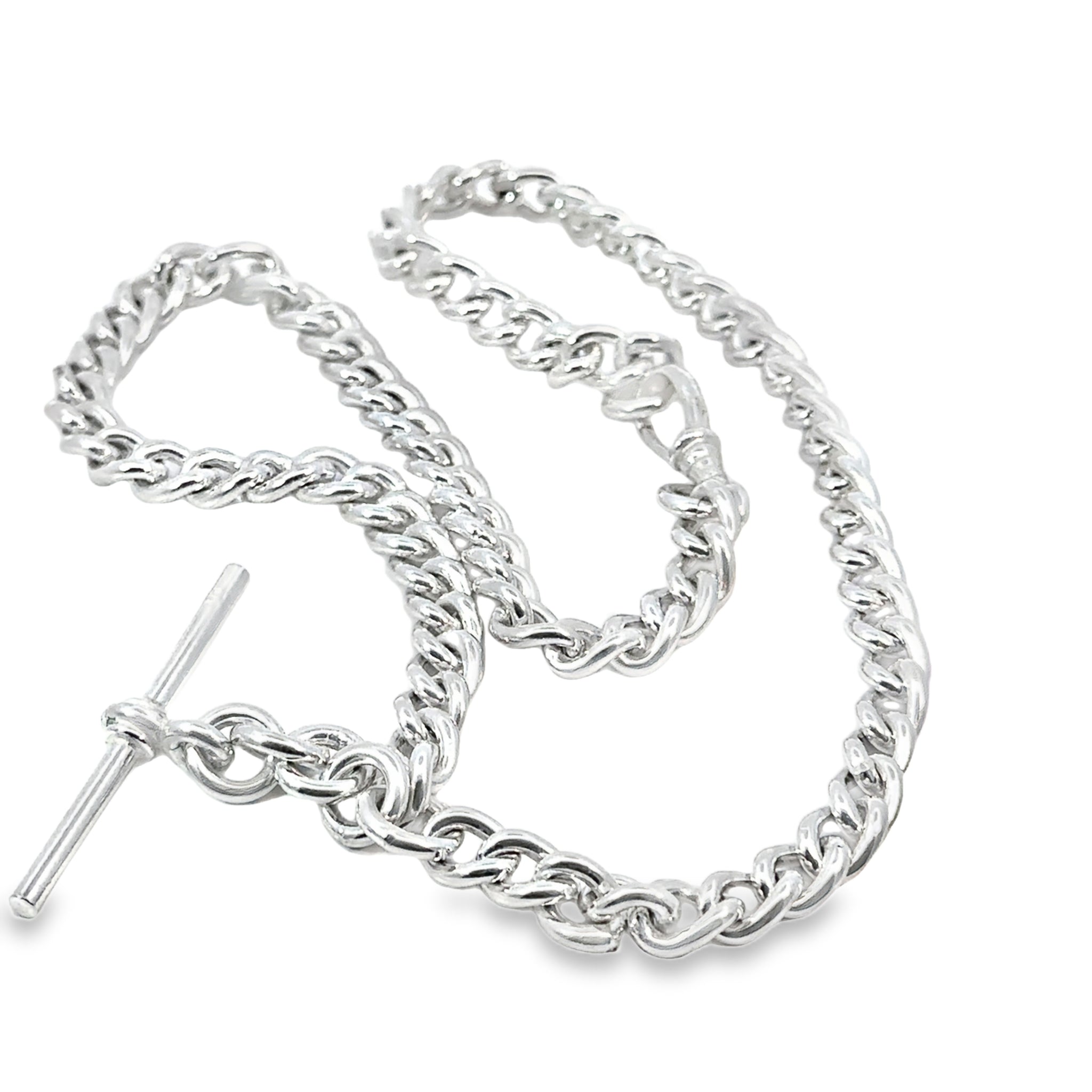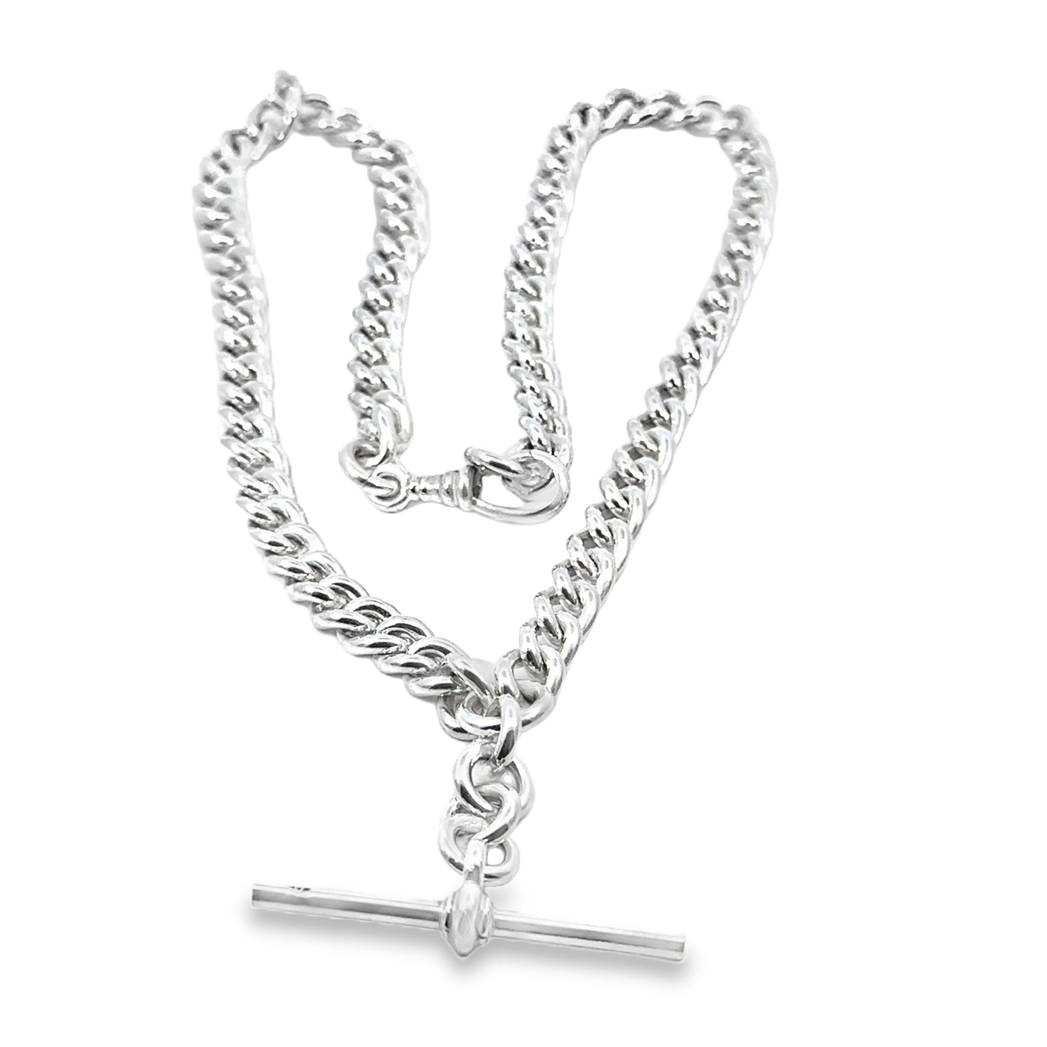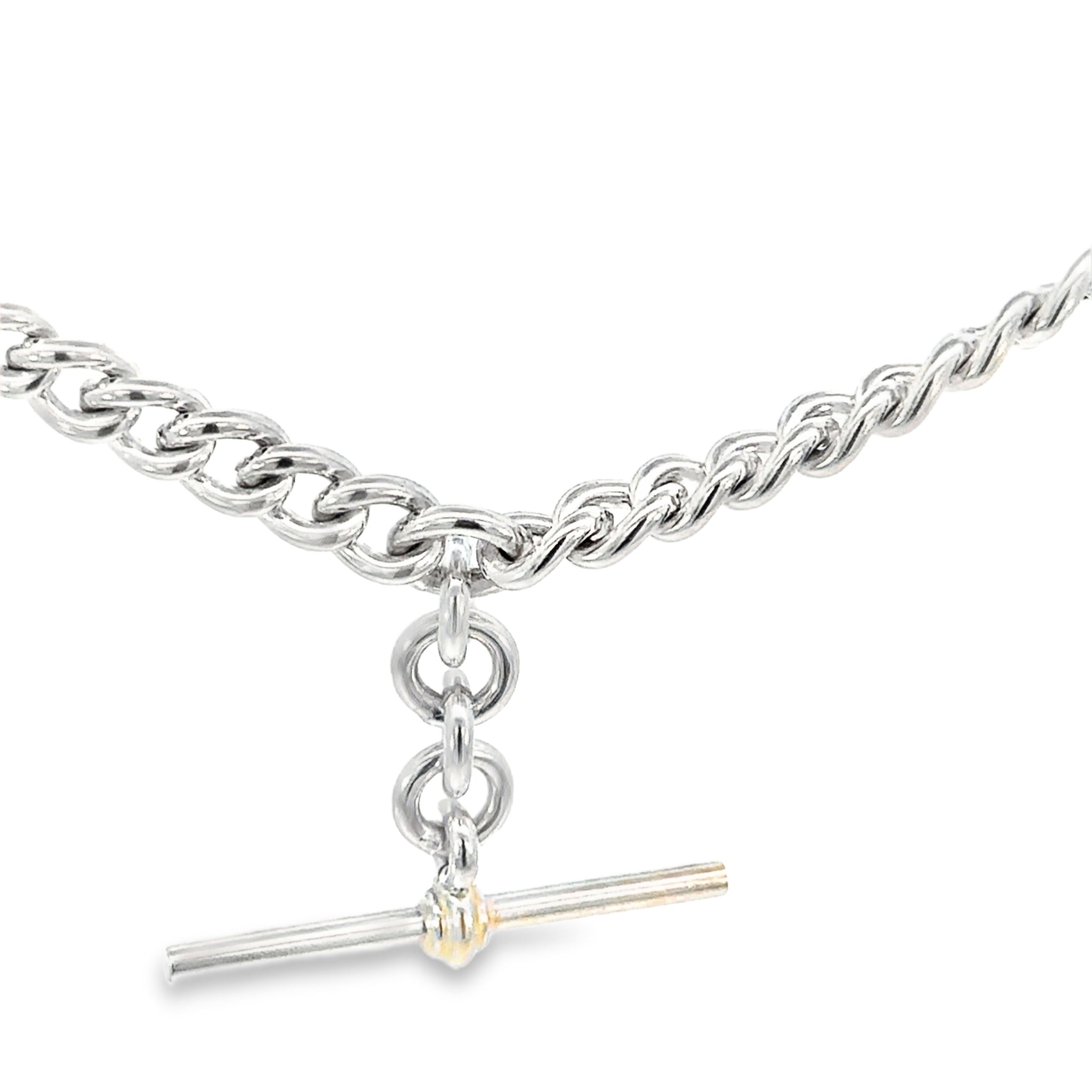 Curb Link Chain Fob Necklace in sterling silver with attached T bar. Dog Clip clasp. Links are from 7.0-8.0mm to 5.0-7.0mm. The T bar measures 40mm. If you need this to be made longer, our jeweller is able to make new matching links - please enquire. Made in NZ.
