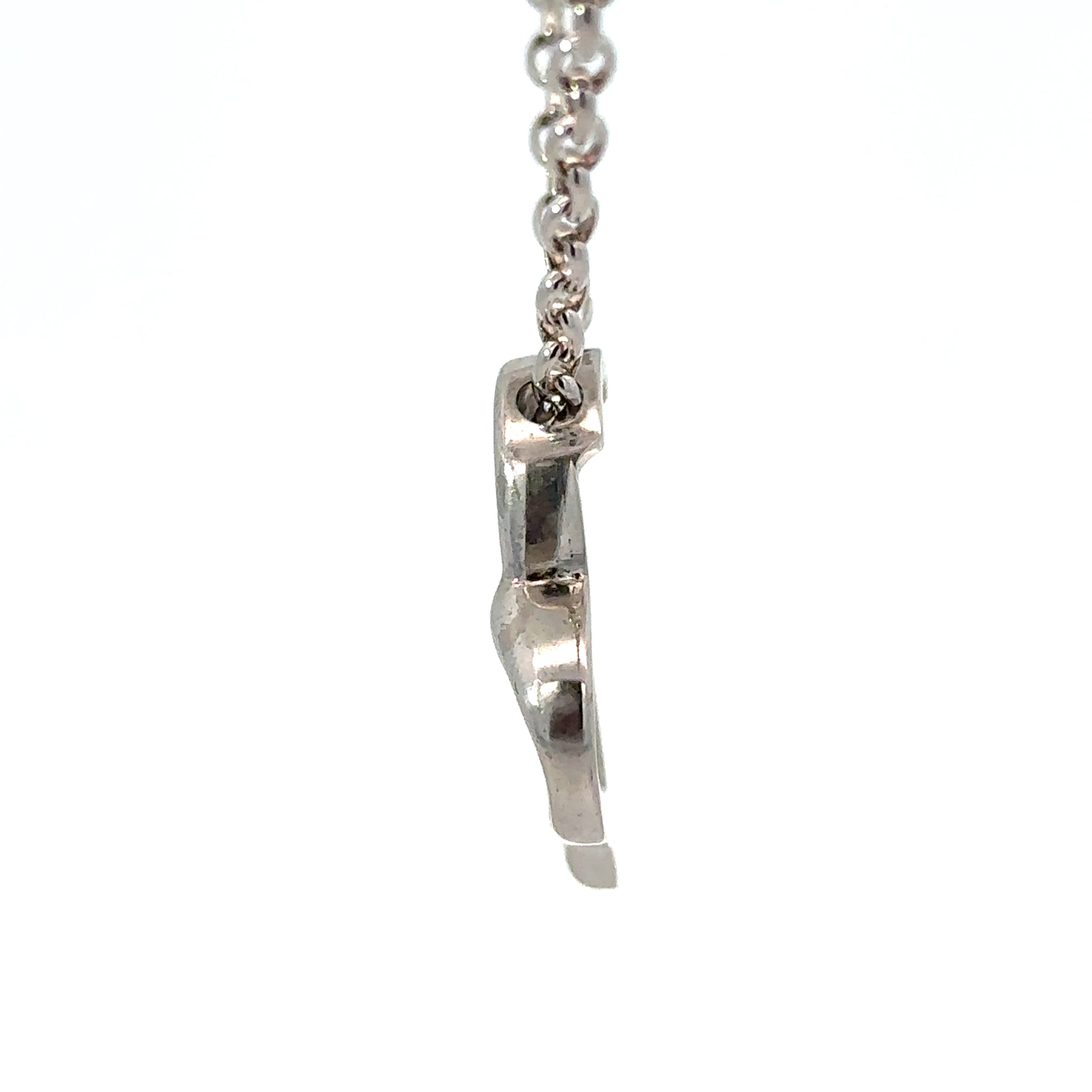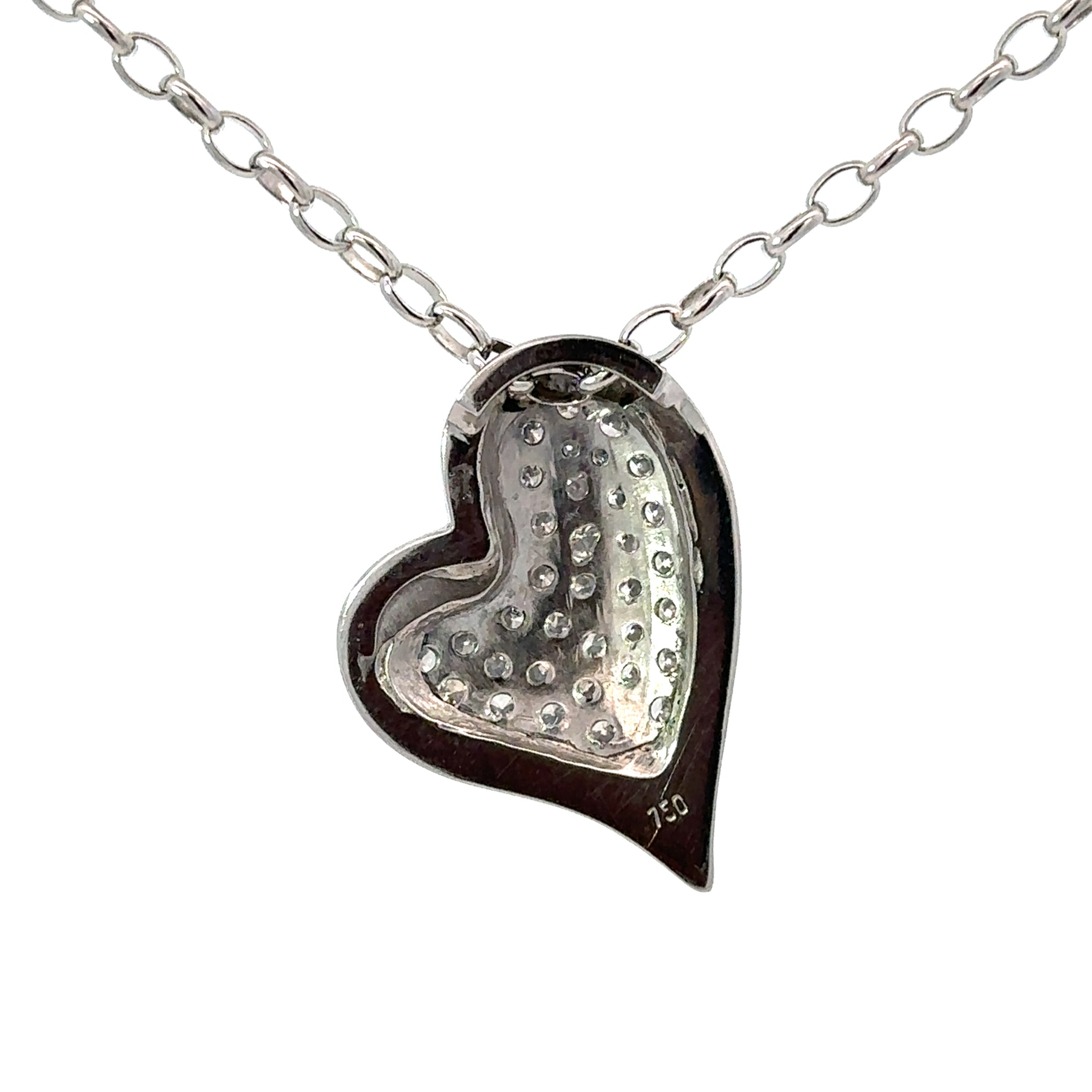 Diamond Heart Necklace in 18ct White Gold. Pave set stylized heart with burnished border and disguised bale. There 34 pave grain set diamonds. On a 9ct white gold oval belcher chain with parrot clasp. Made in New Zealand.