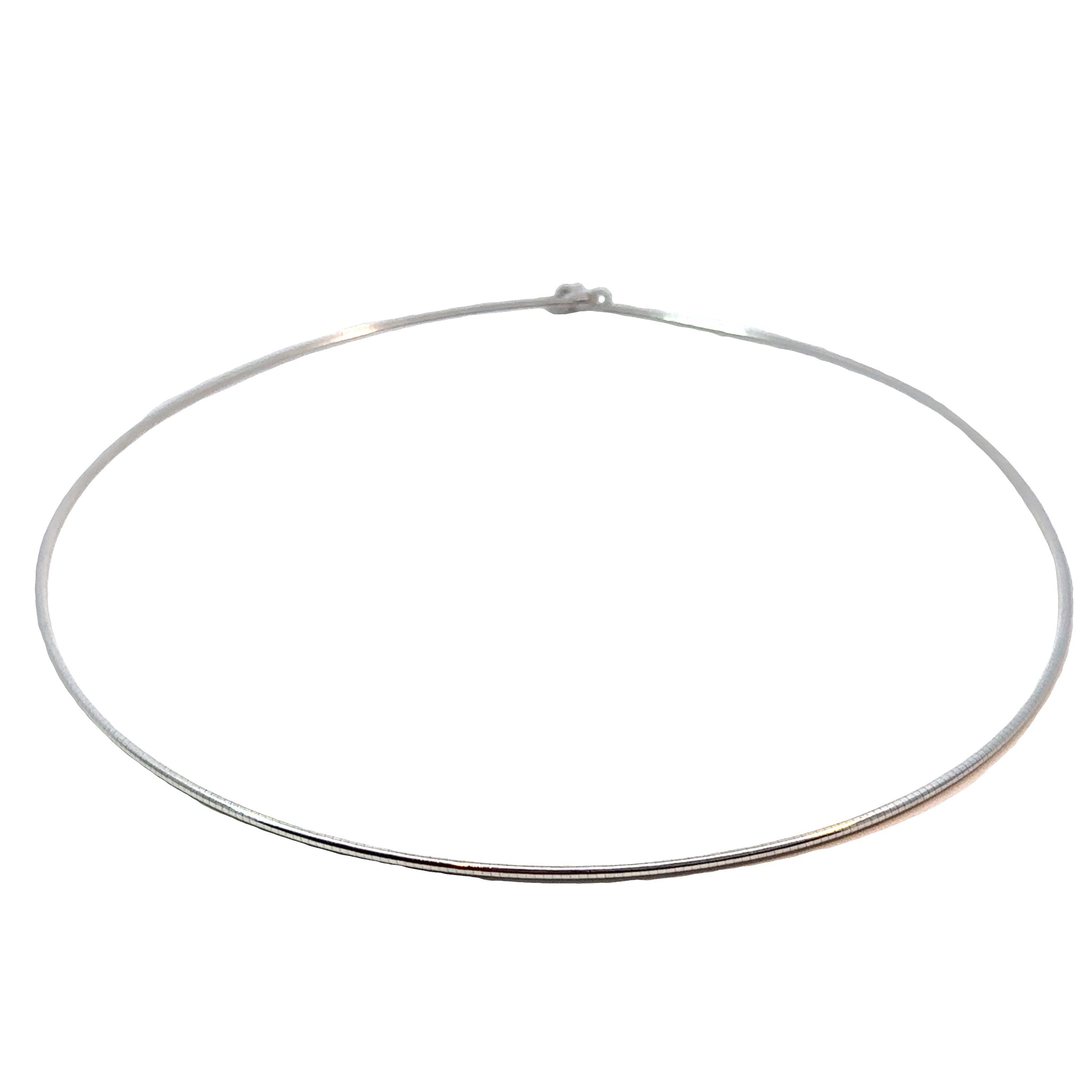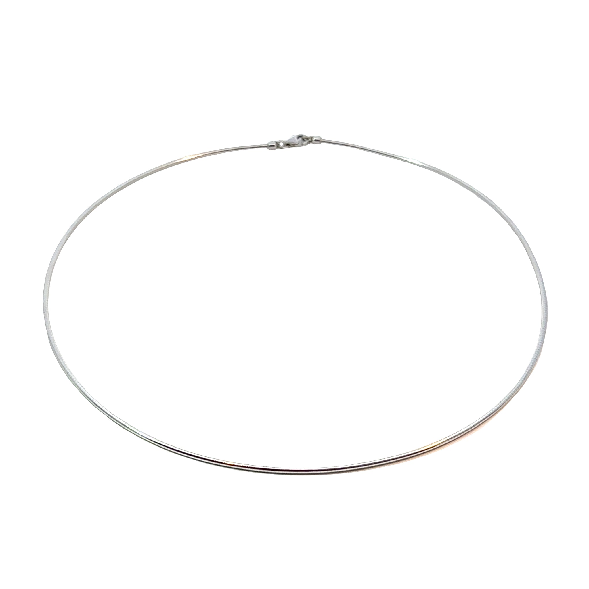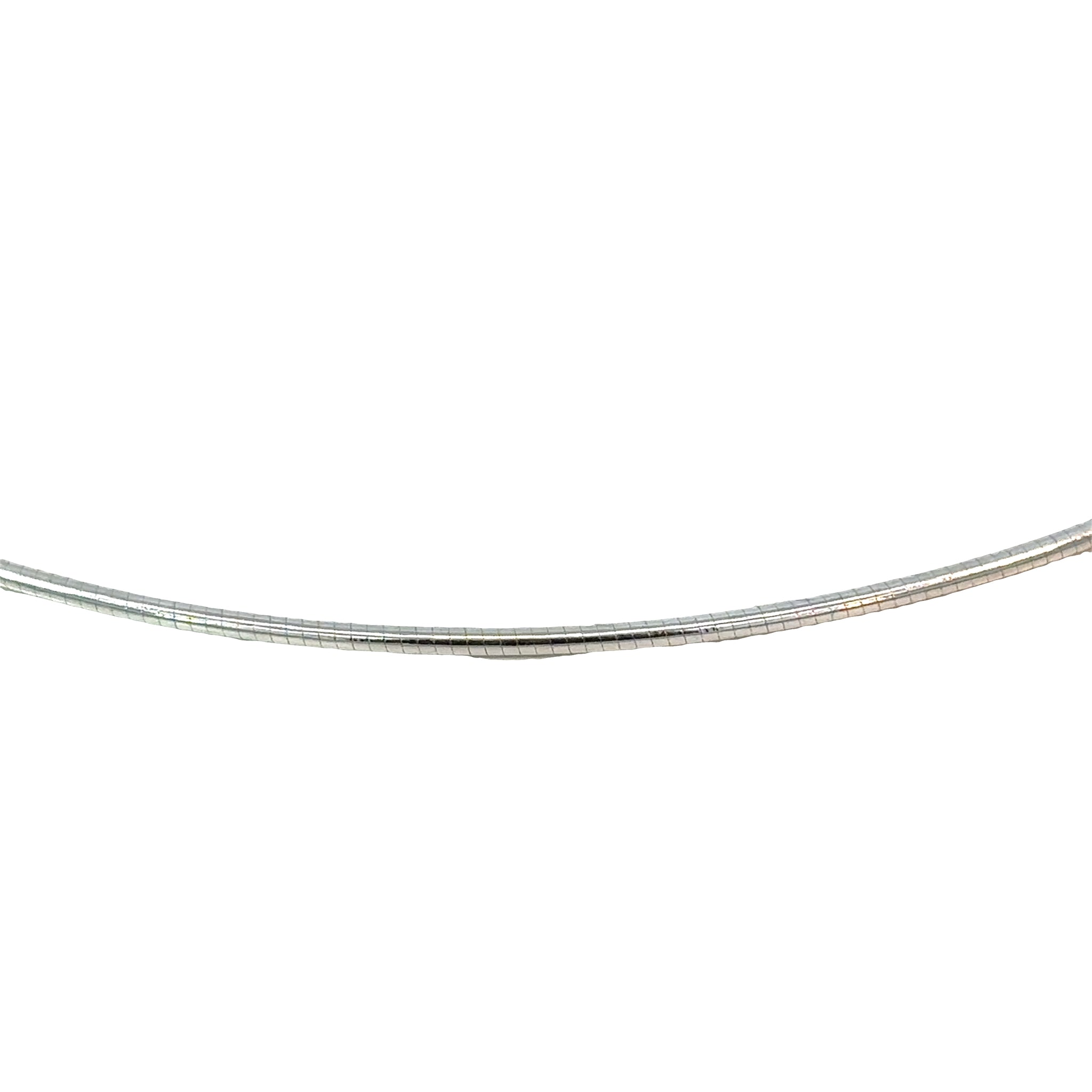 Omega Style Collier Necklace in 18ct White Gold. Round profile 1.5mm. Plain capped end-pieces with a parrot clasp.  Made in Italy.