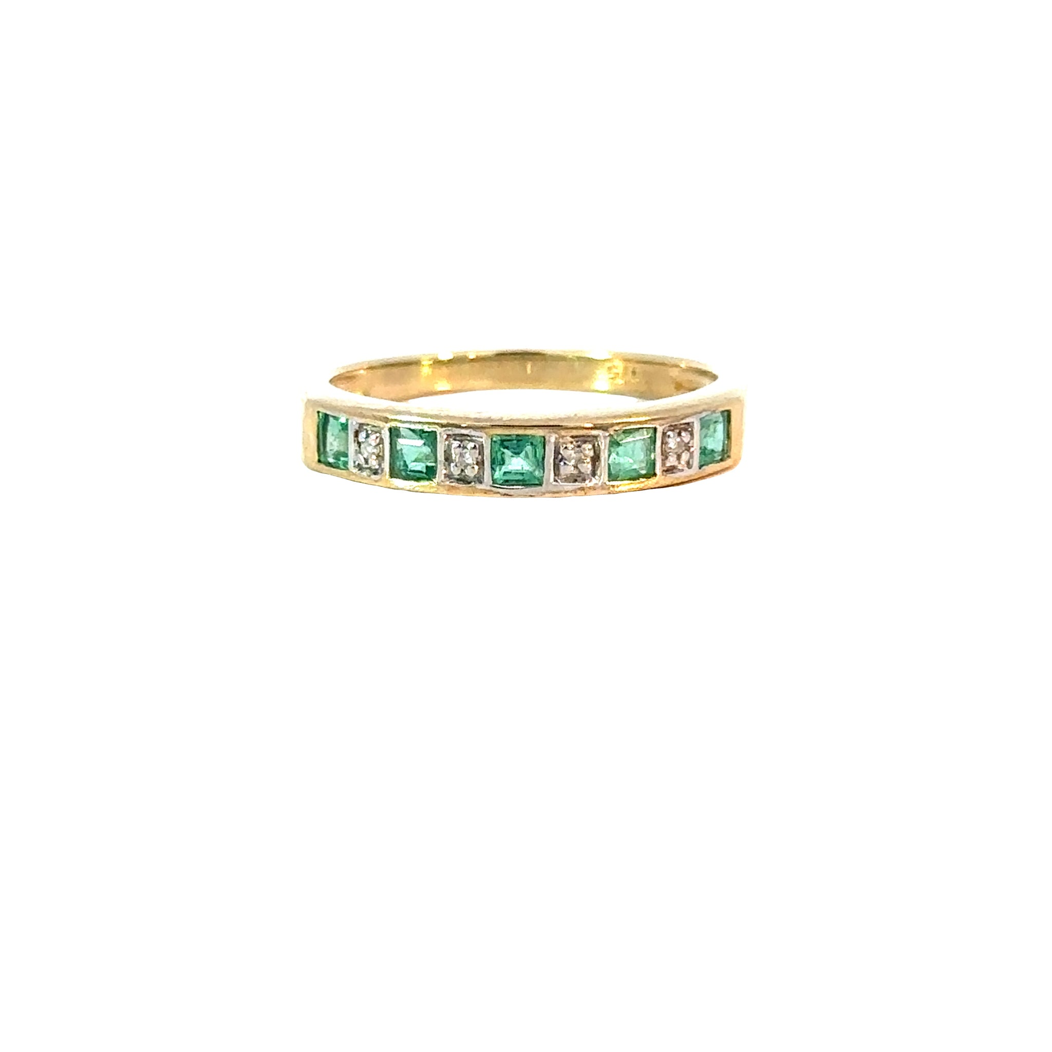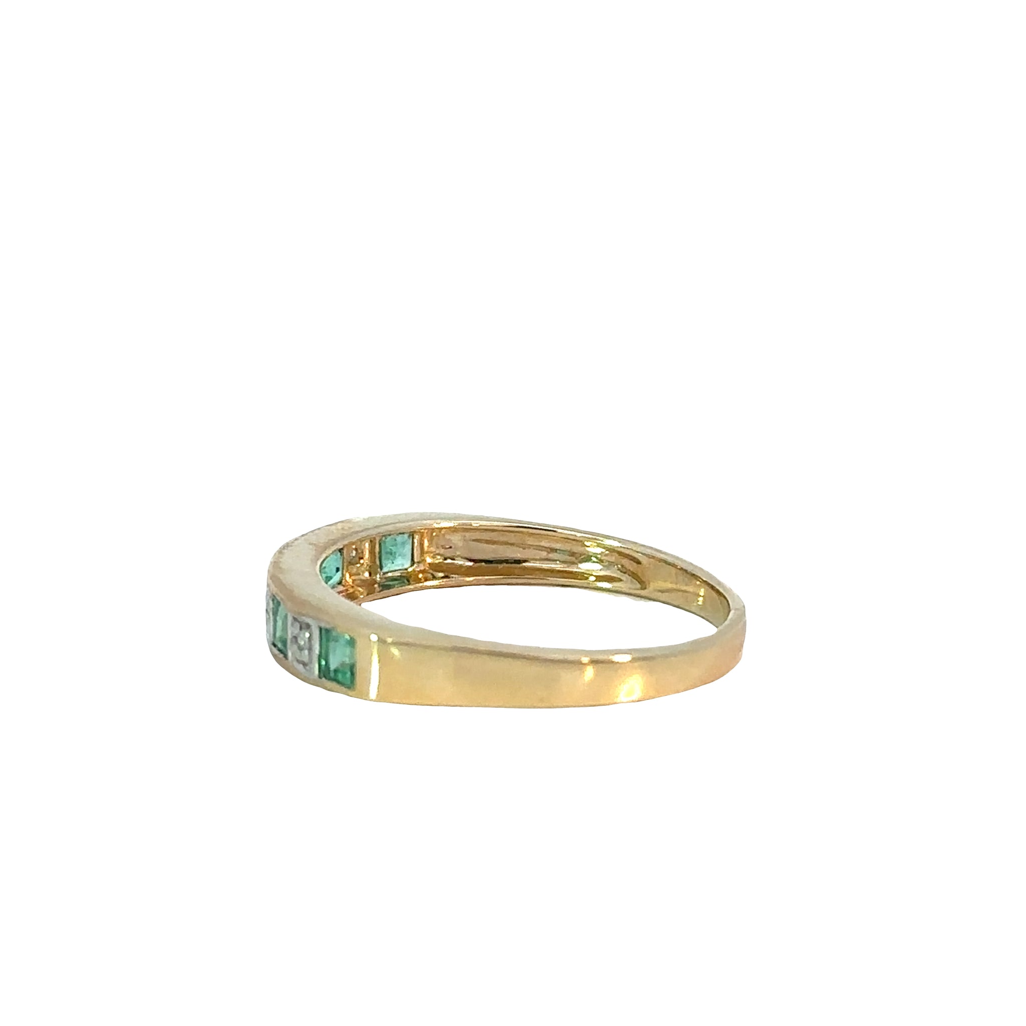 Emerald Diamond Channel Set Ring in 9ct Yellow Gold.  On a plain tapered band