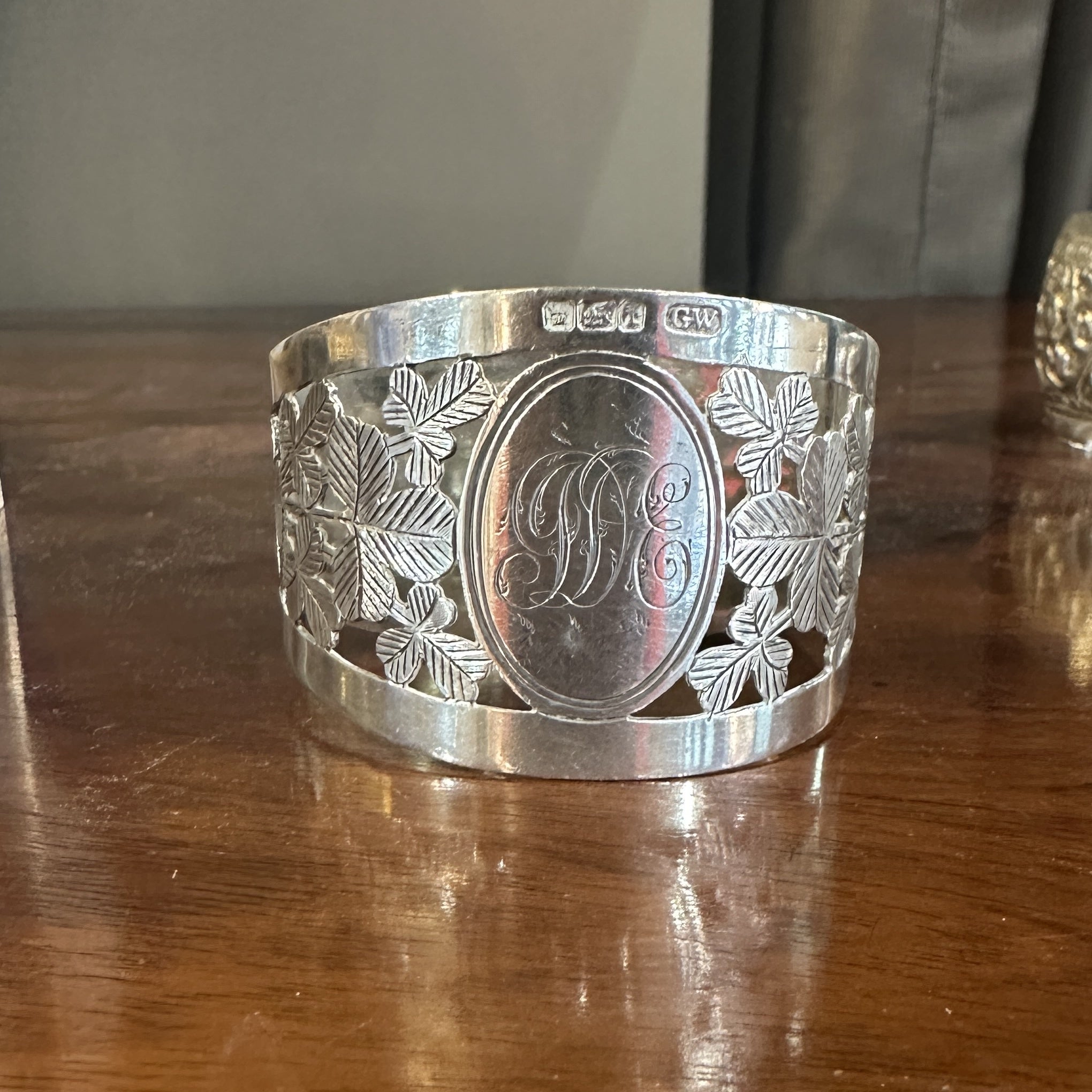 A lovely antique sterling silver napkin ring. Hallmarked stamped dating back to 1903 in Sheffield with pierced decoration and flat back. Engraved with D.P.E.
