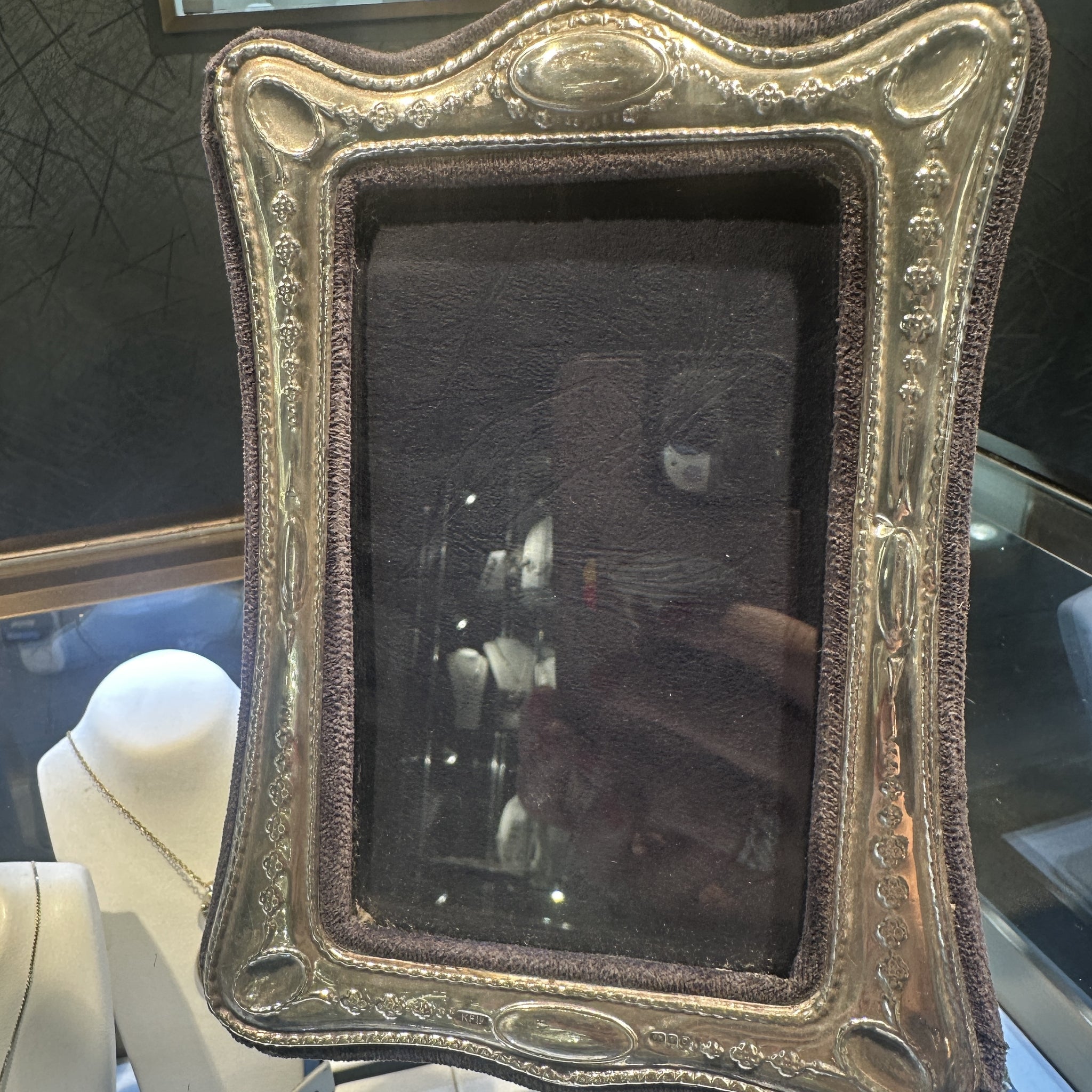 Sterling Silver Photo Frame -8Wx13Hcm internal measurement. With scroll pattern edges. Has glass insert. Velvet backing.