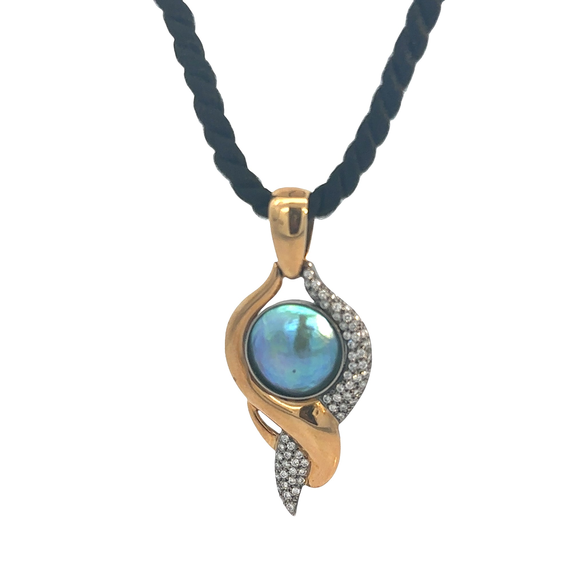 Gorgeous Tahitian Dome Pearl Pendant twisted in 18ct Yellow Gold around, diamonds encrusted in half of the pendant. Attached to a black rope chain with an 18ct Yellow Gold clasp.