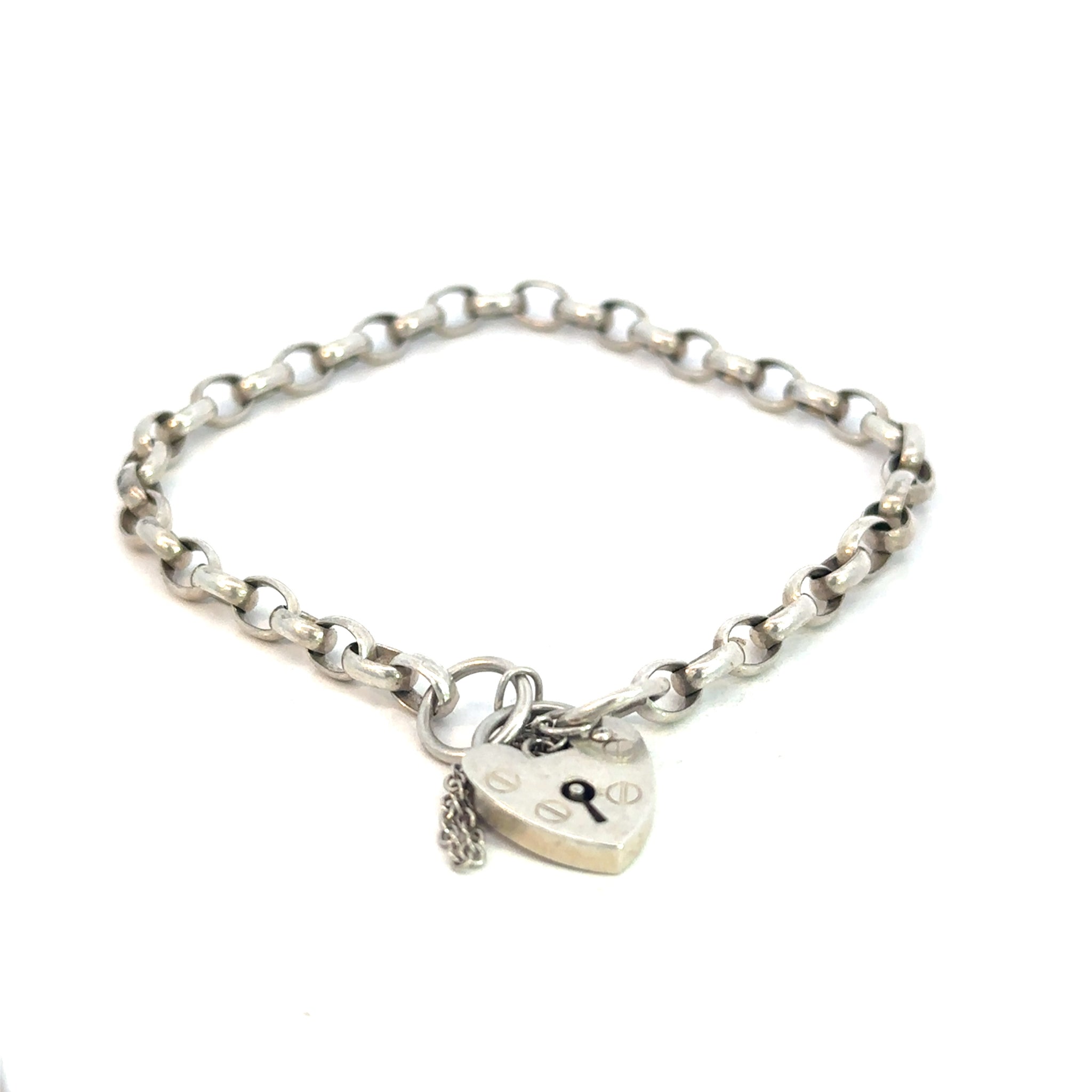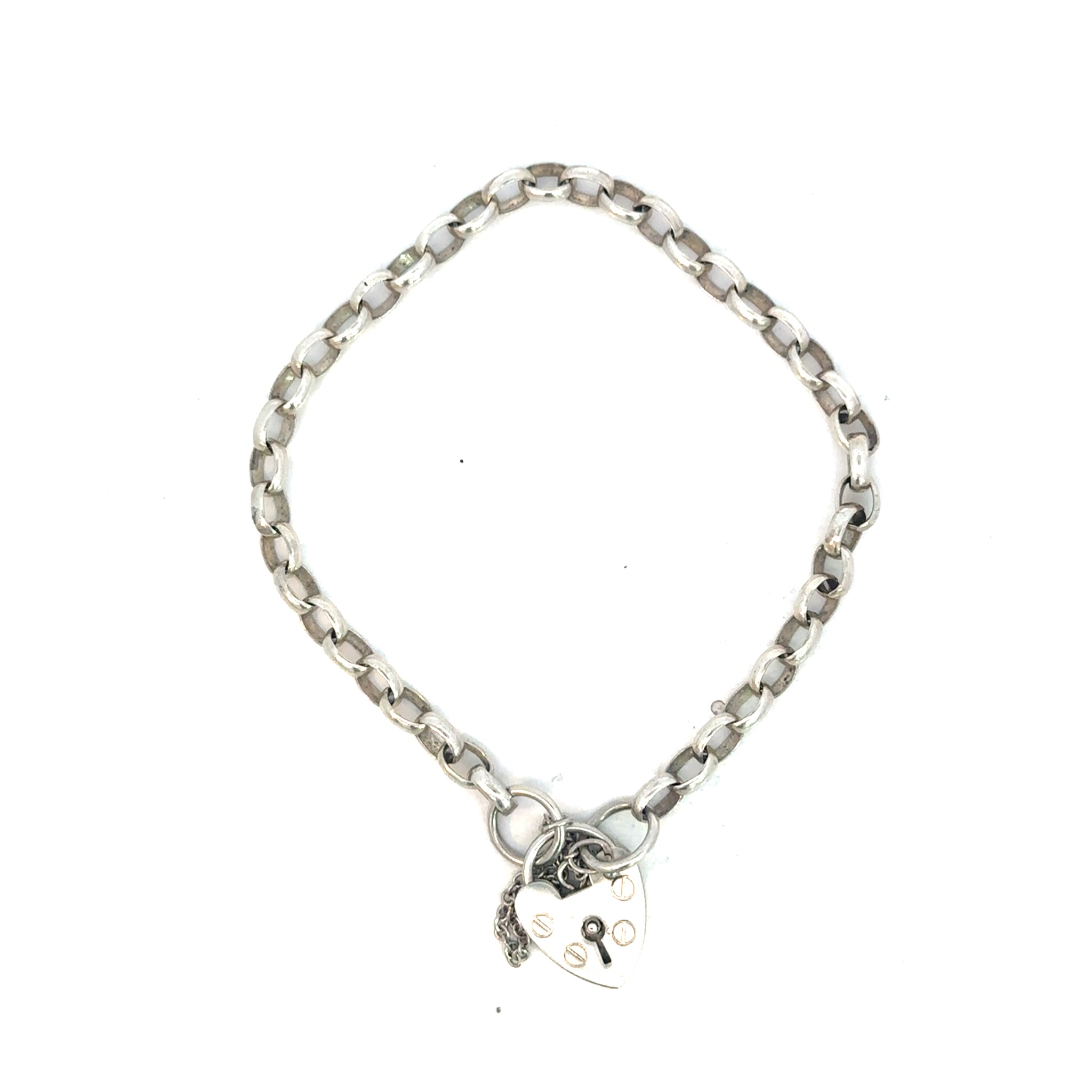 A classic oval link belcher bracelet, fitted with a heart padlock and safety chain.