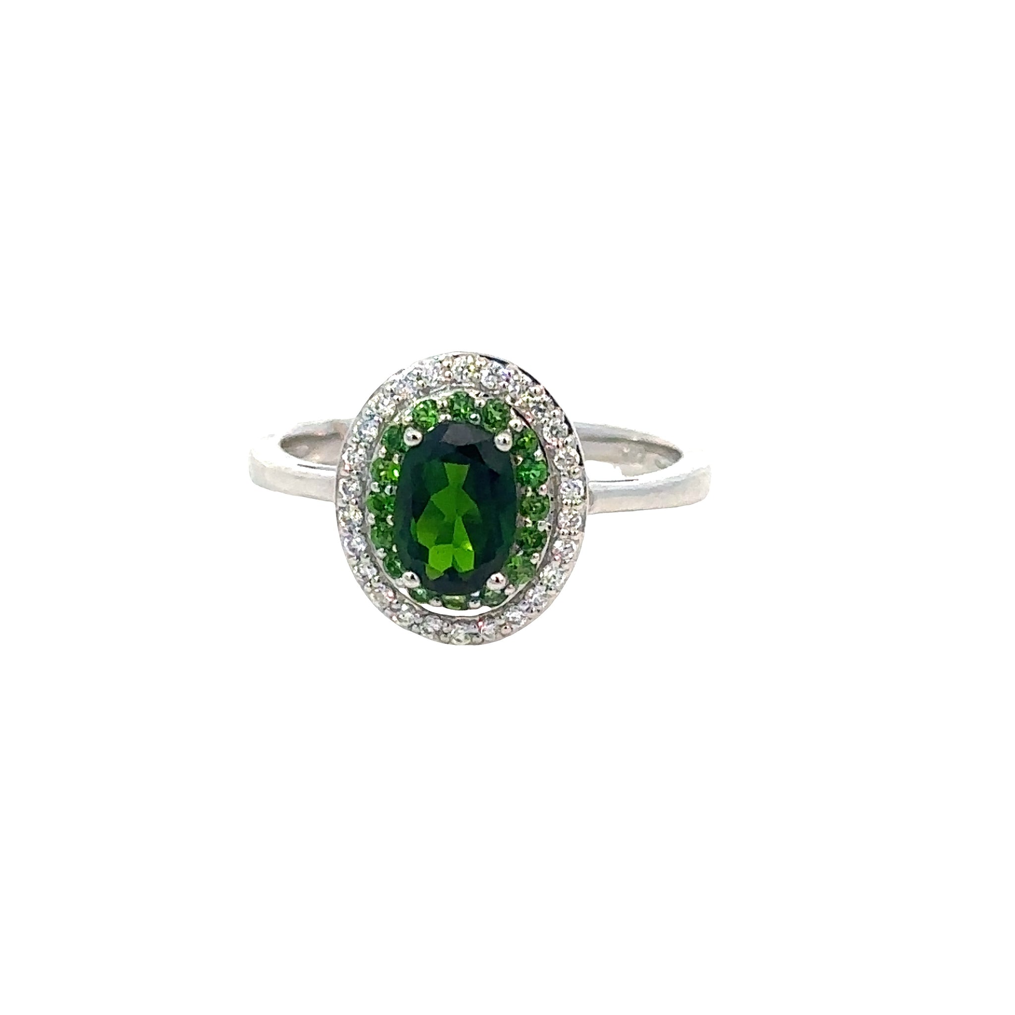 Stunning Chromium Diopside Ring set in a 4-pillar holding in 9ct White Gold. Halo of tsavorite garnet clusters around, and a larger halo of cluster diamonds, creating a layered look. Band set in 9ct White Gold.