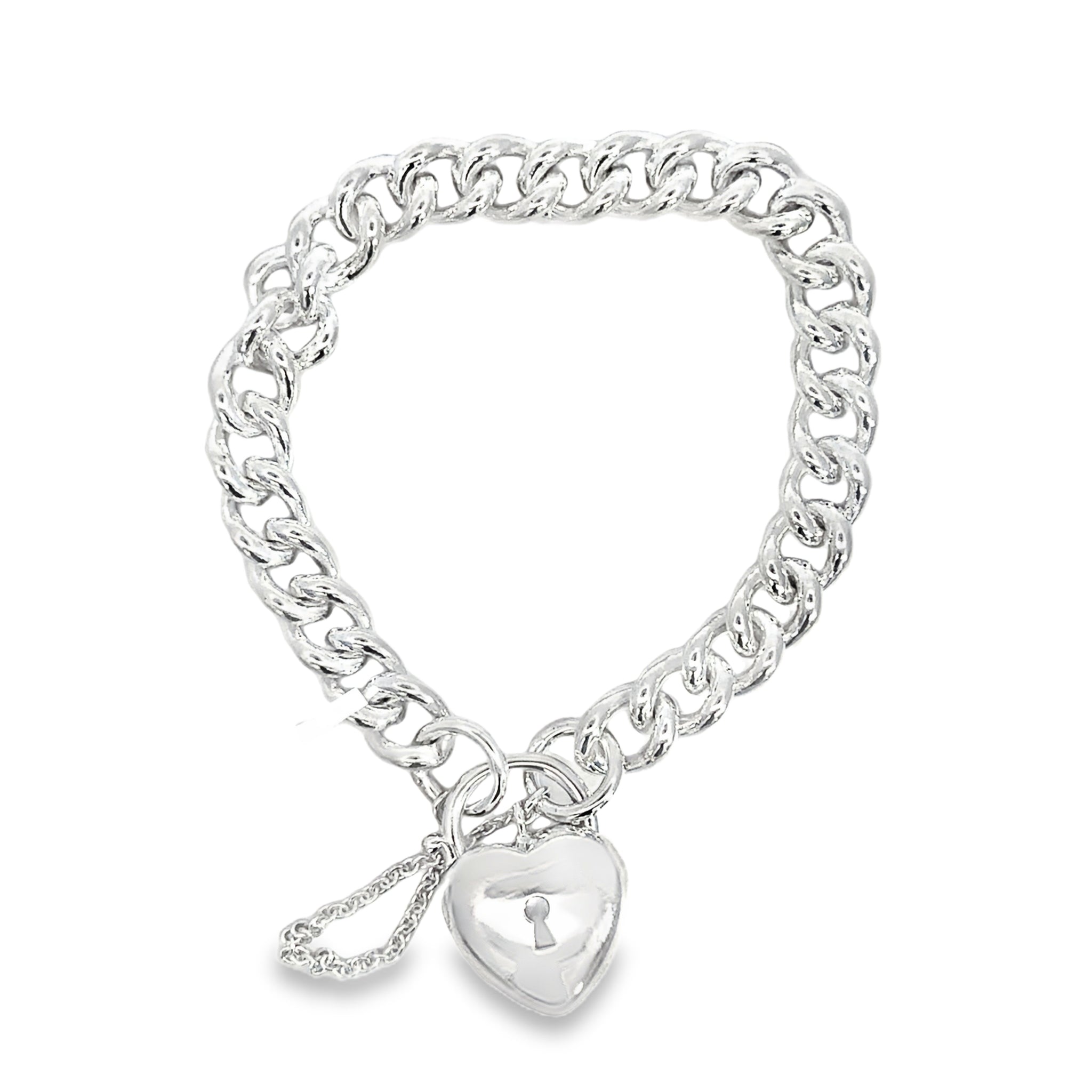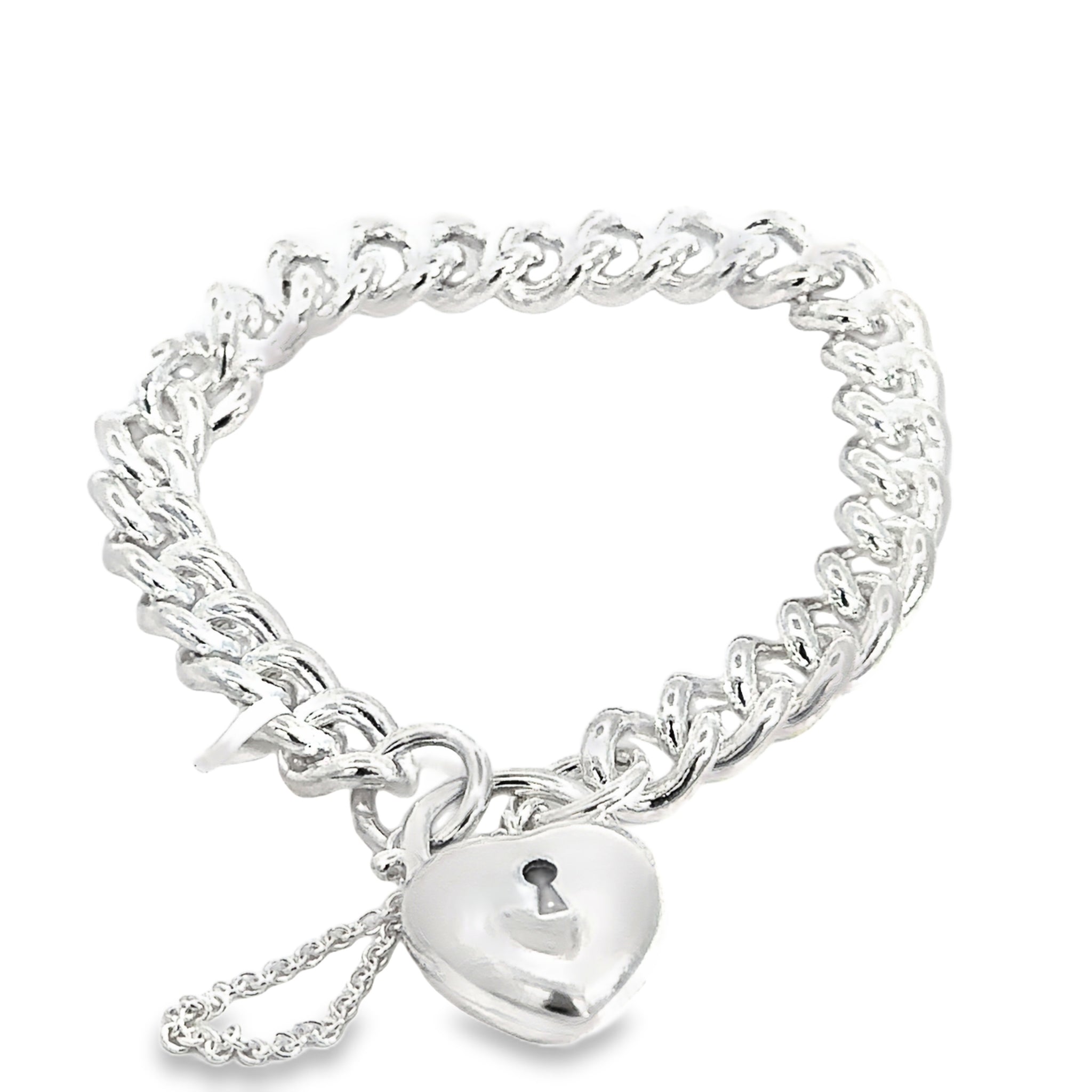 Sterling Silver Curb Link Bracelet with puff heart lock. Has a safety chain attached through the heart. The heart measures 18.5Wx24.3Hmm. Made in NZ.