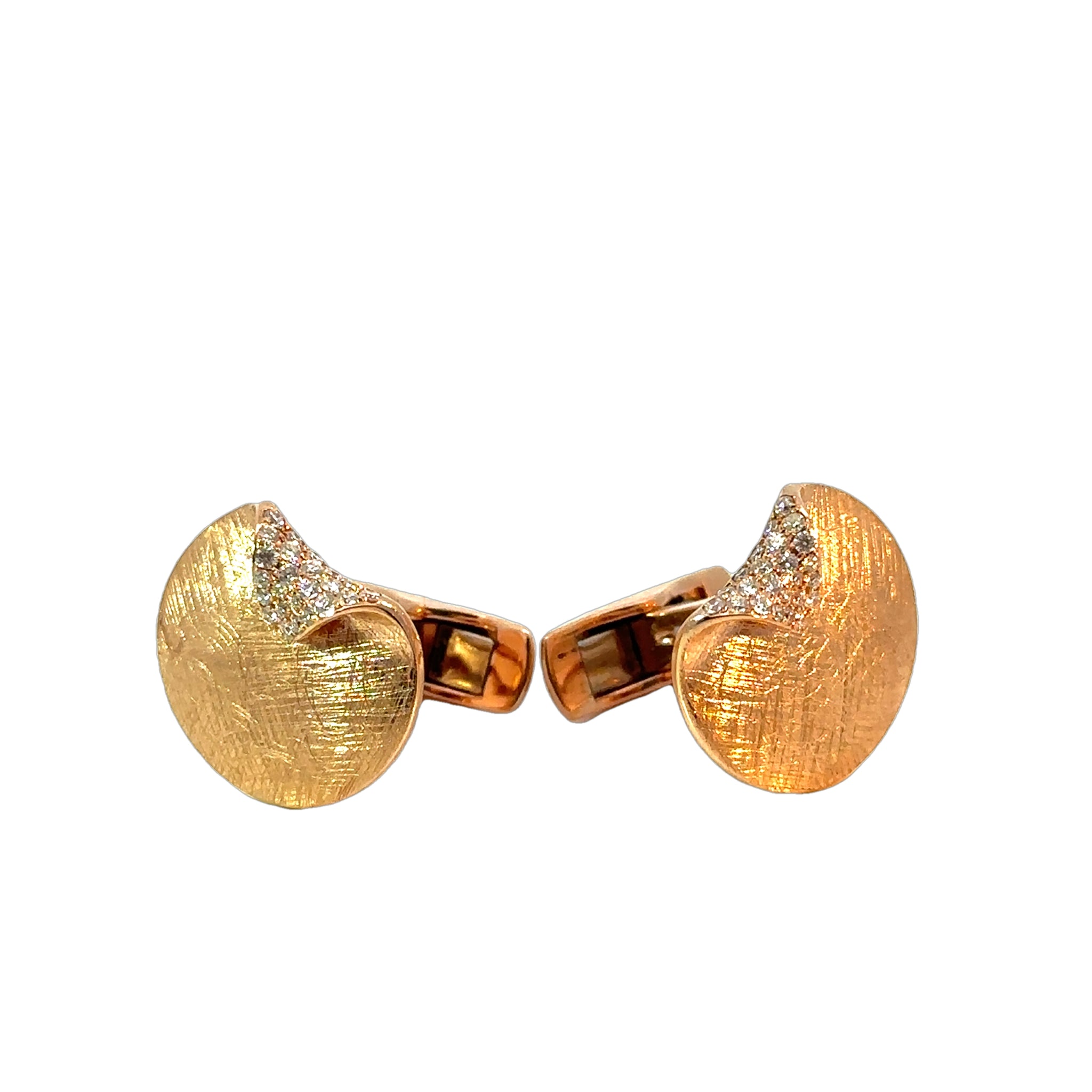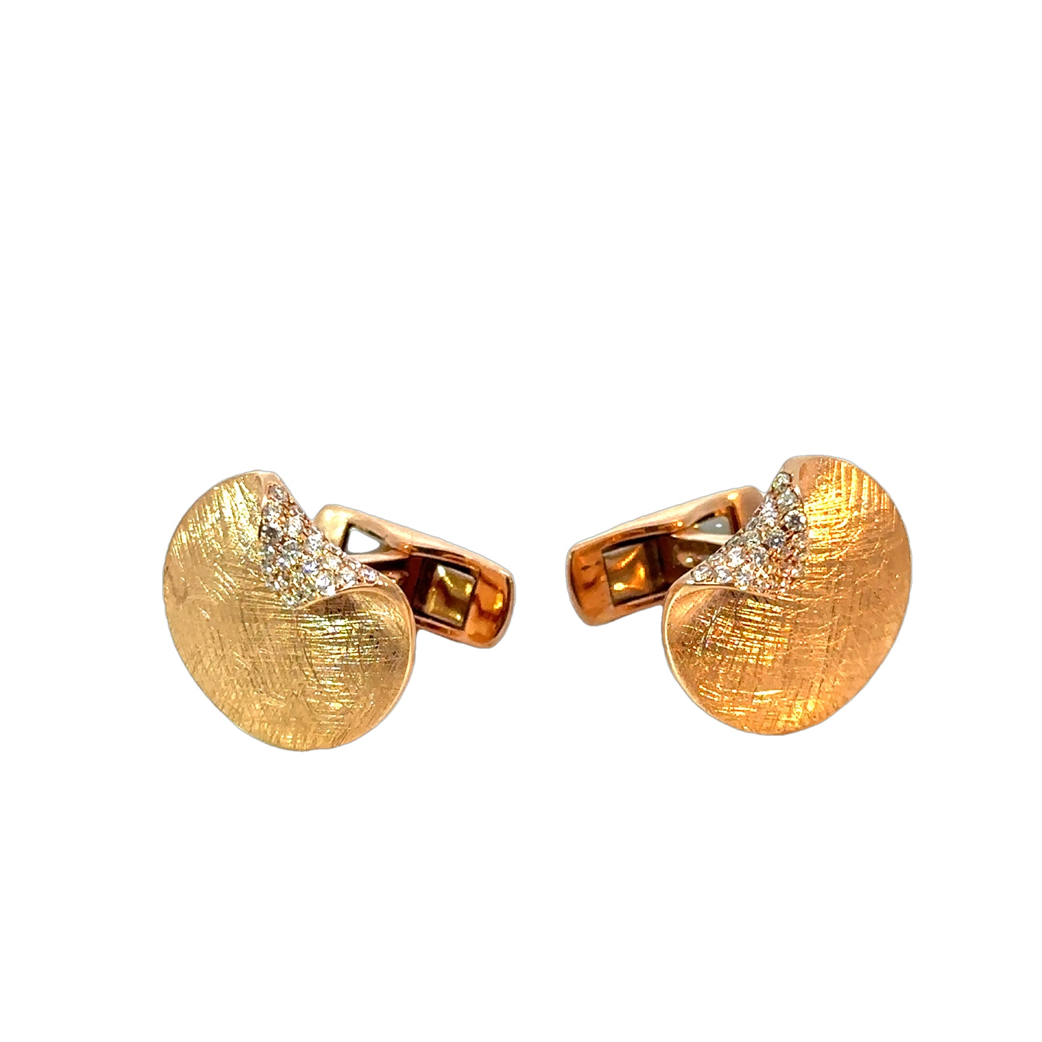 Lovely Leaf Shaped Cuff Links set in 14ct Rose Gold with a matte finish. Small fold over on each cuff link with 24 Diamond inserts on each one. Like new.
