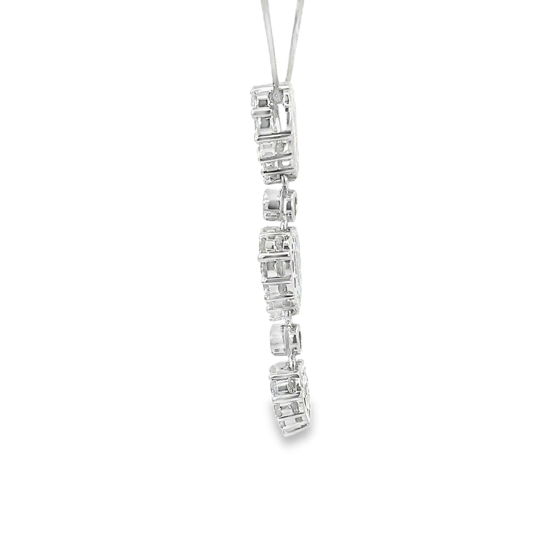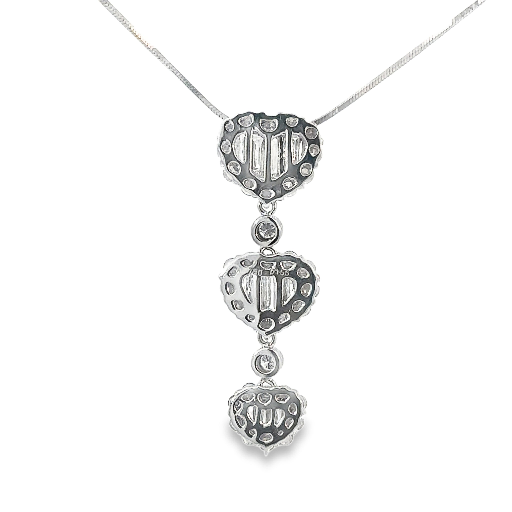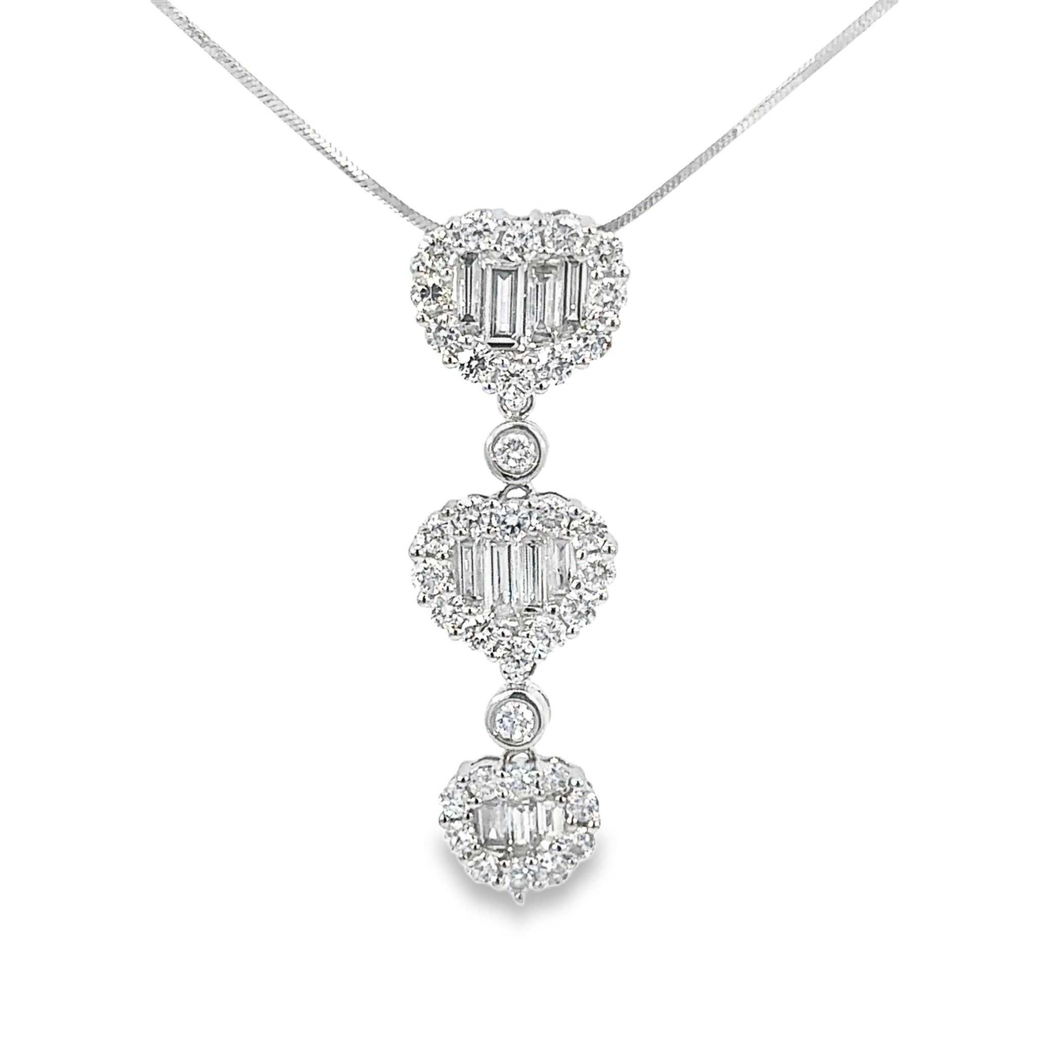 Three Tier Diamond Pendant in 18ct White Gold. A gorgeous mix of baguette cut and round diamonds create a stunning look with three graduating hearts which are all articulated so movement to catch the light. Pierced backing so a chain can thread through it. Chain sold separately.