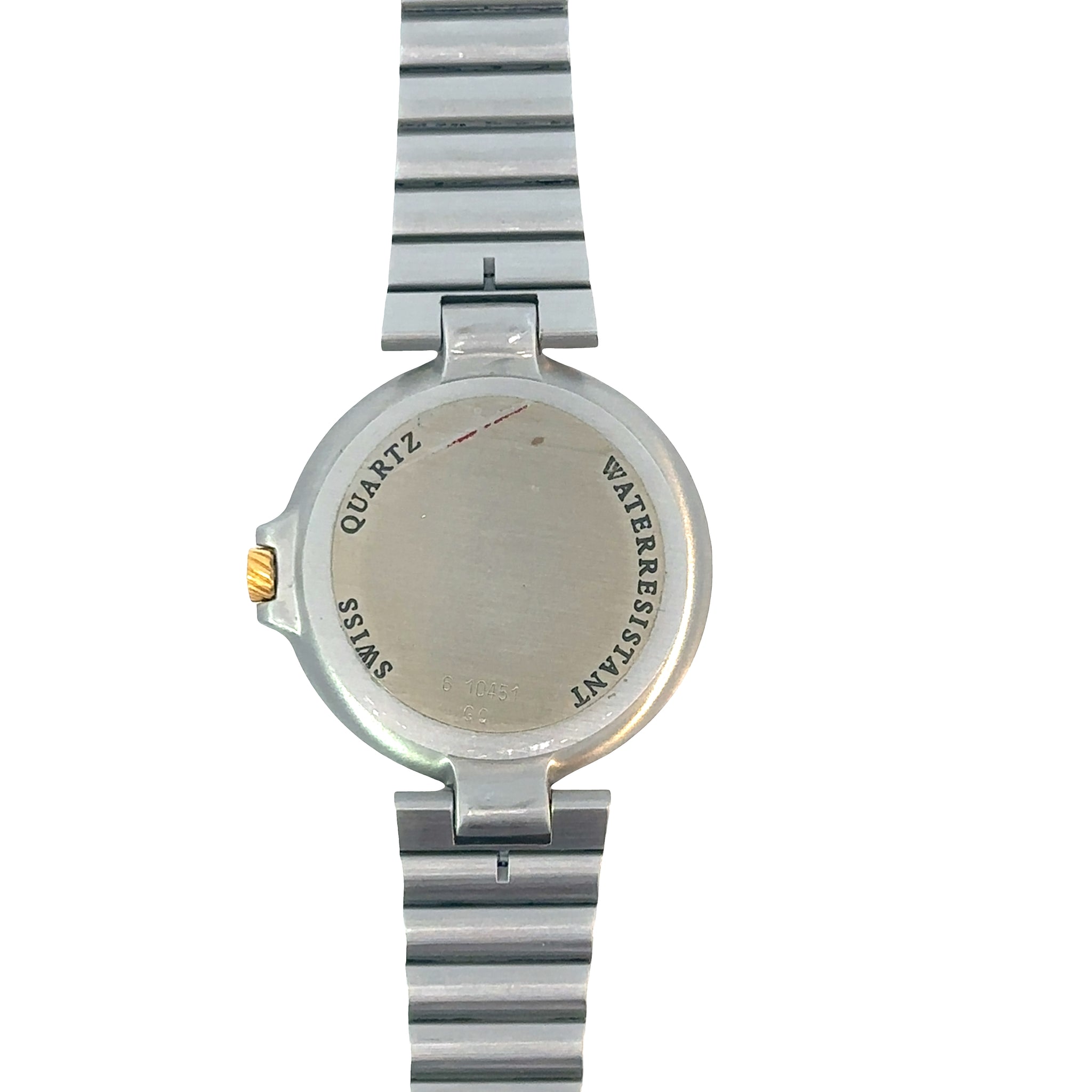 This Vintage 1980s Dunhill Millennium wristwatch features a 30mm wide stainless steel and gold-plated case. Its black enamel dial includes roman numerals and date aperture.