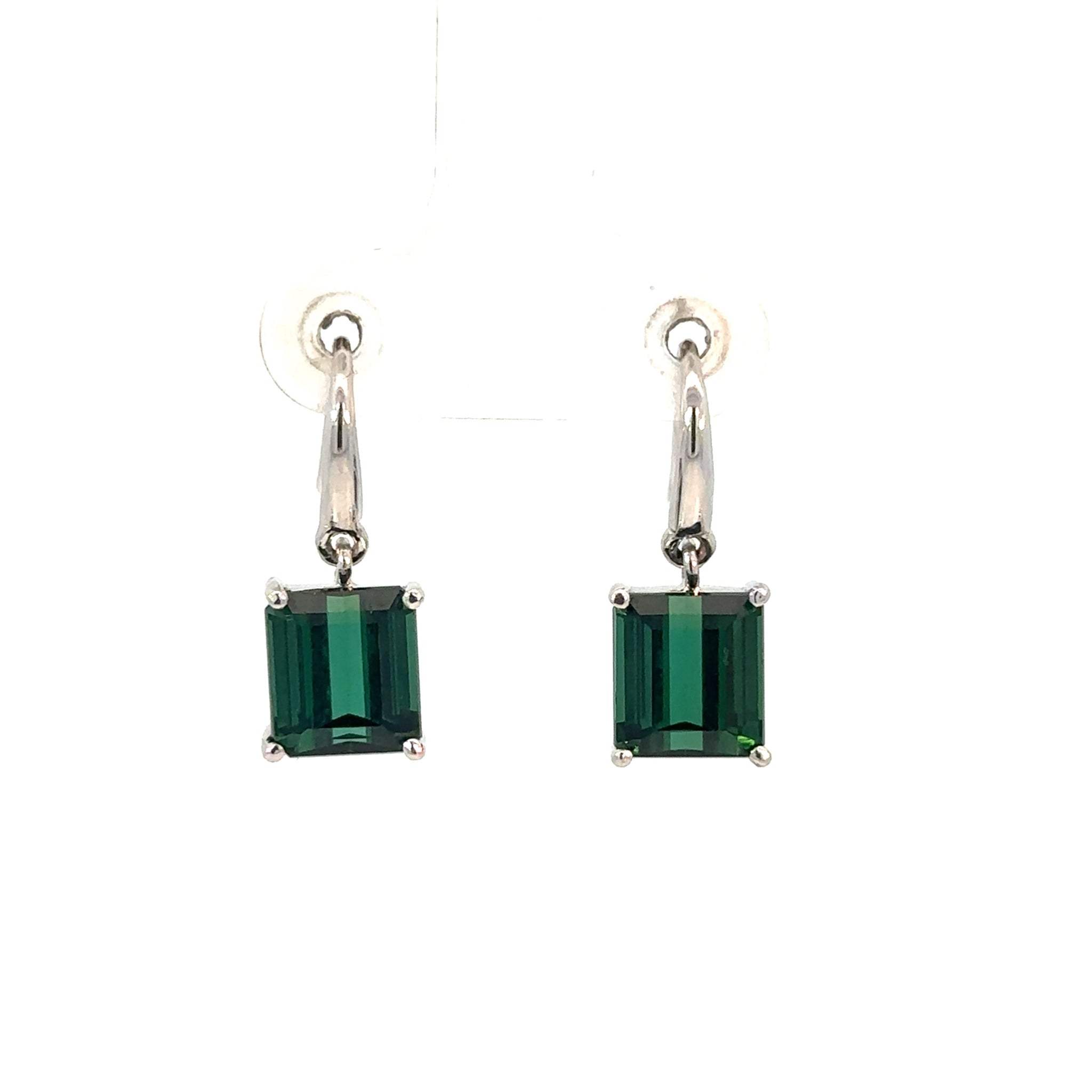 Green Tourmaline Drop Earrings in 18ct White Gold. Emerald cut tourmalines in a four claw setting floating on 18ct white gold wire hooks. There is a matching necklace and ring available.