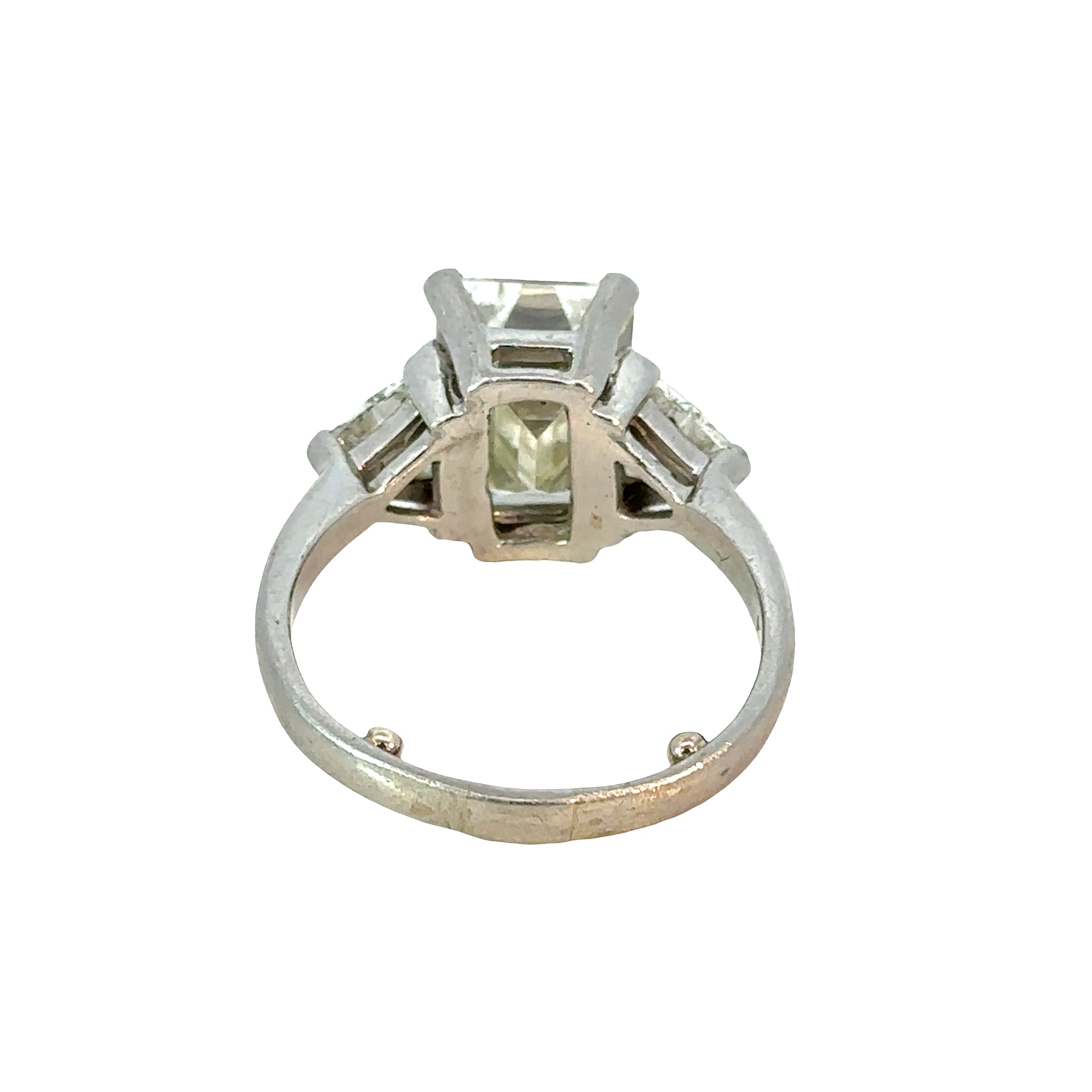 Large Diamond Emerald Cut Ring set in platinum. The large emerald-cut diamond is set in a 4-pillar and double bezel setting, with a trilliant-cut diamond either side. On a plain, narrow, rounded band with raised tapered shoulders. There are stabiliser beads applied inside the shank - these can be removed if not required.