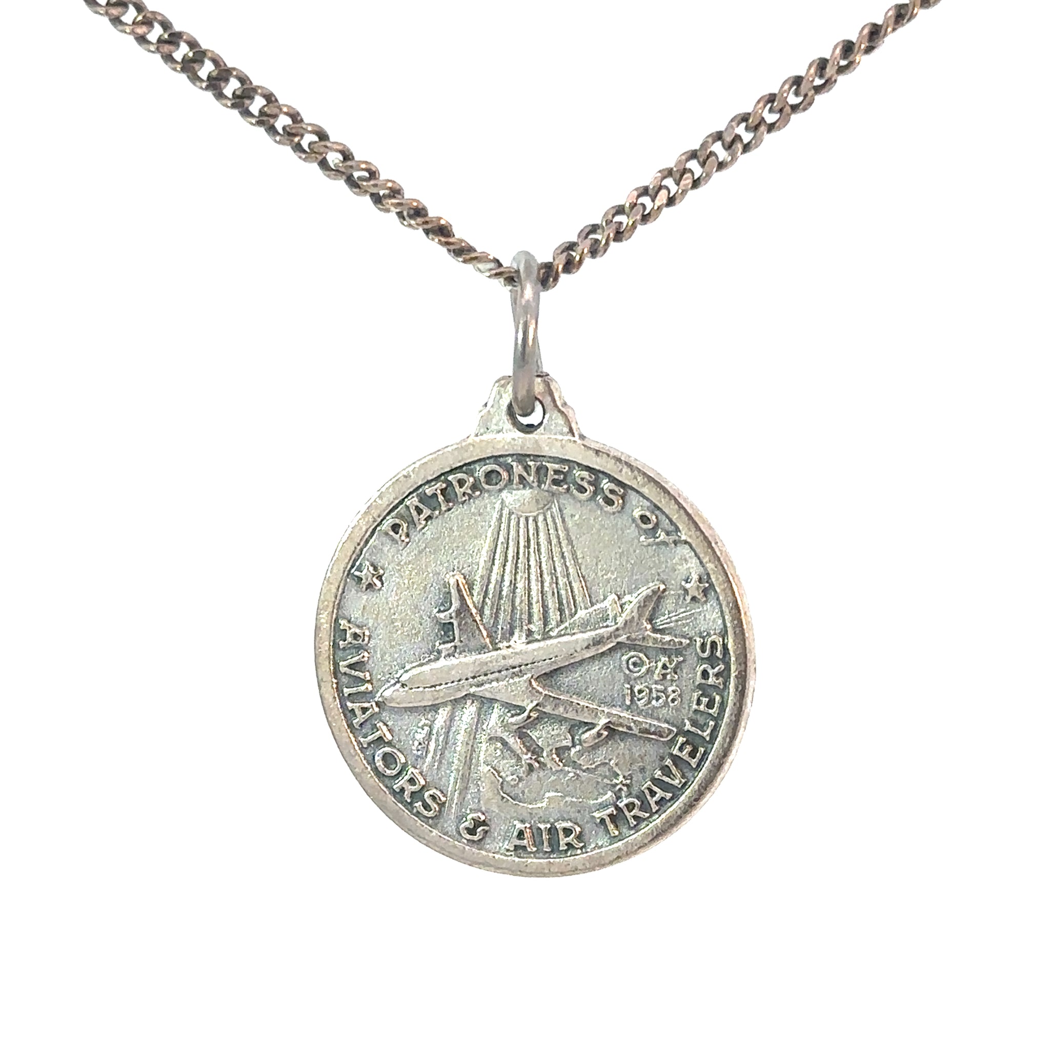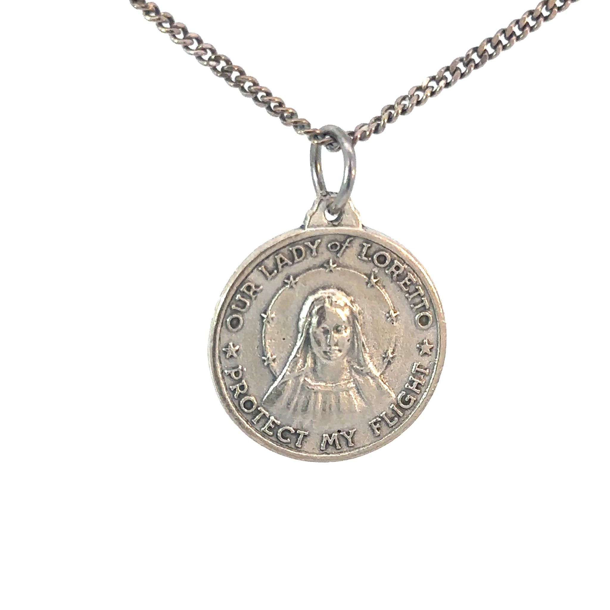 Our Lady of Loretto Pendant set in Stirling Silver. Flight Travellers pendant, with the patron saint of flight. Has 'Our Lady of Loretto' and 'Protect my flight' on one side, and 'Patroness of Aviators and Air Travellers' on the other side.