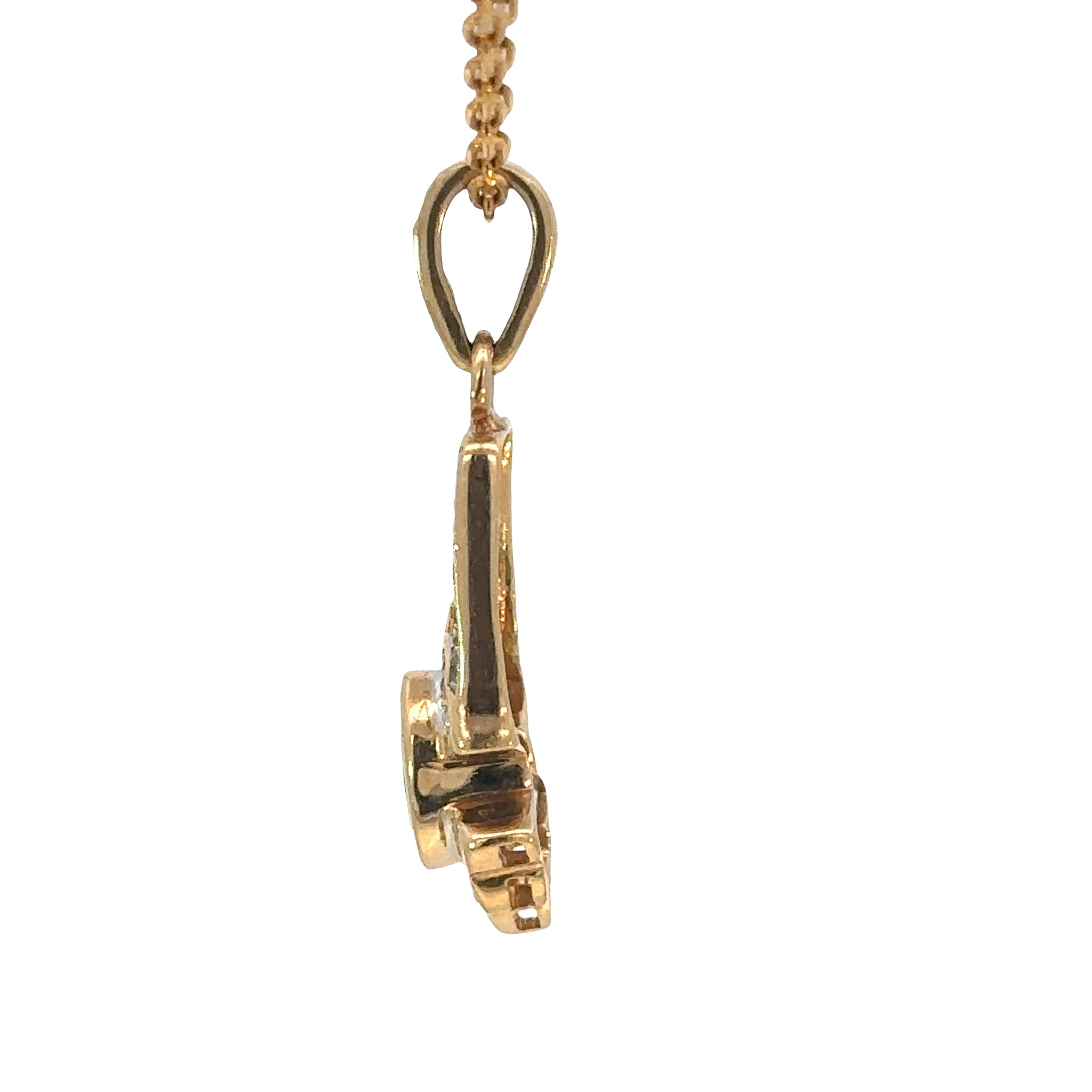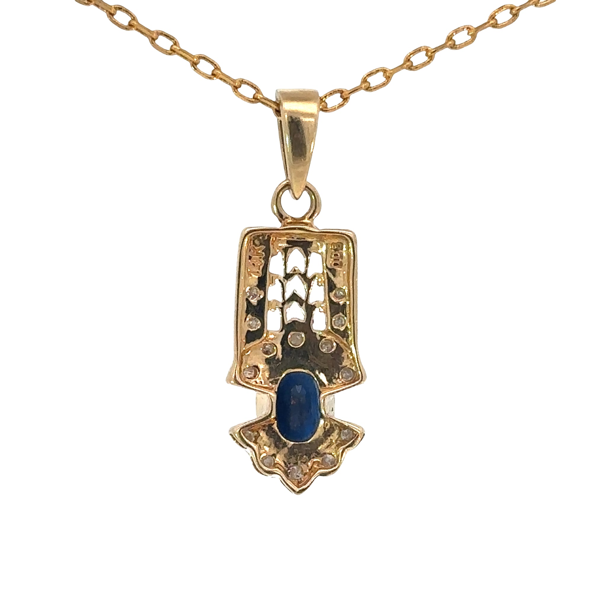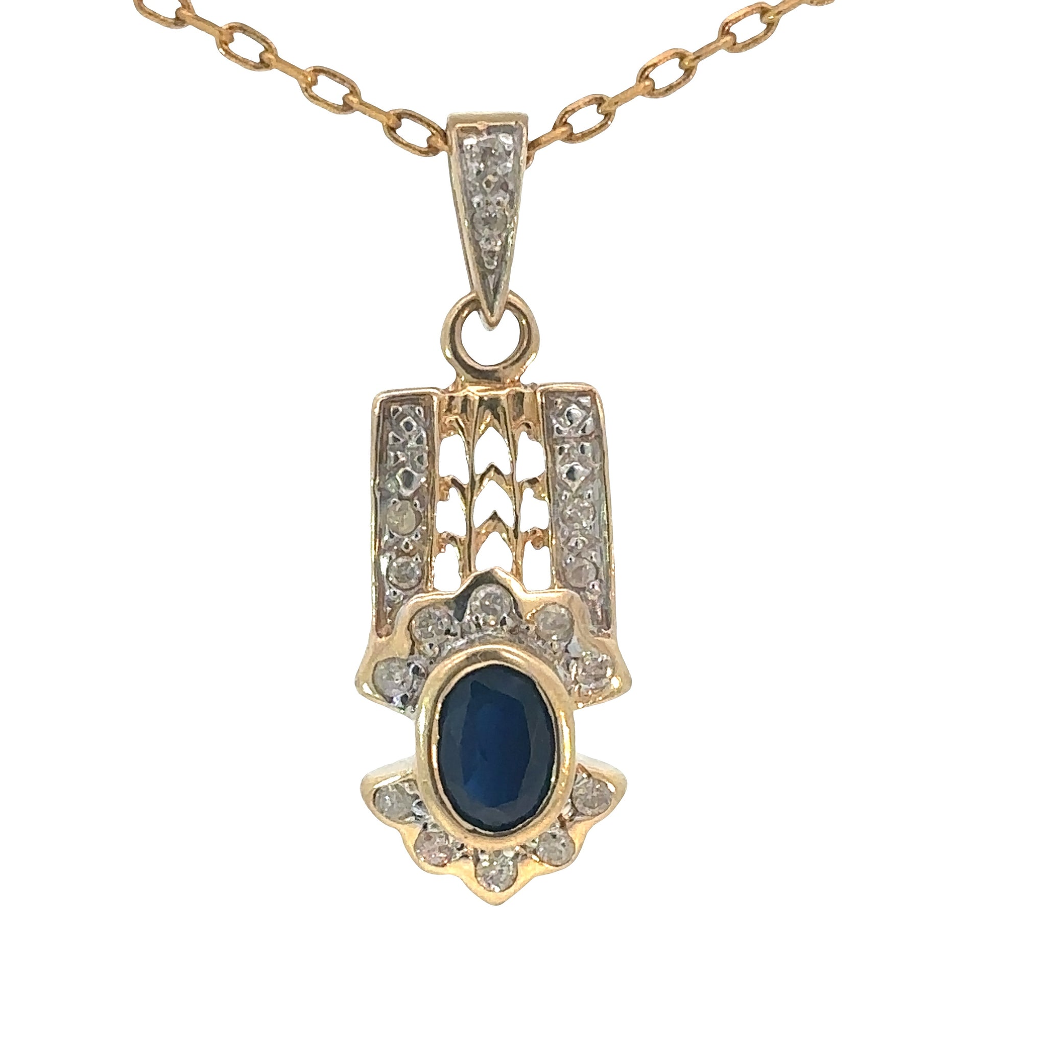 Oval Sapphire Diamond Pendant set in 14ct yellow gold. The pendant is a fancy cluster style drop with sapphire rub set with diamonds which are bead set. On a diamond 'V' shaped bale which allows movement. (Chain not included).