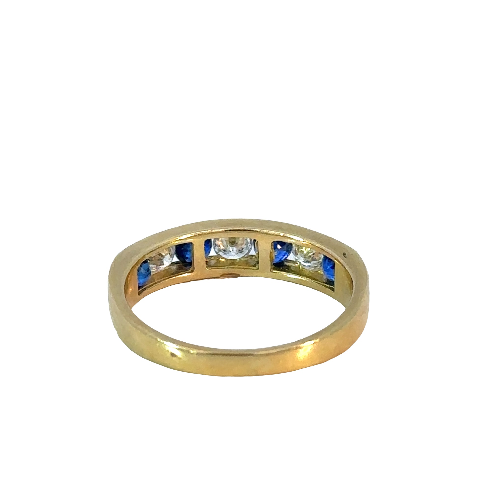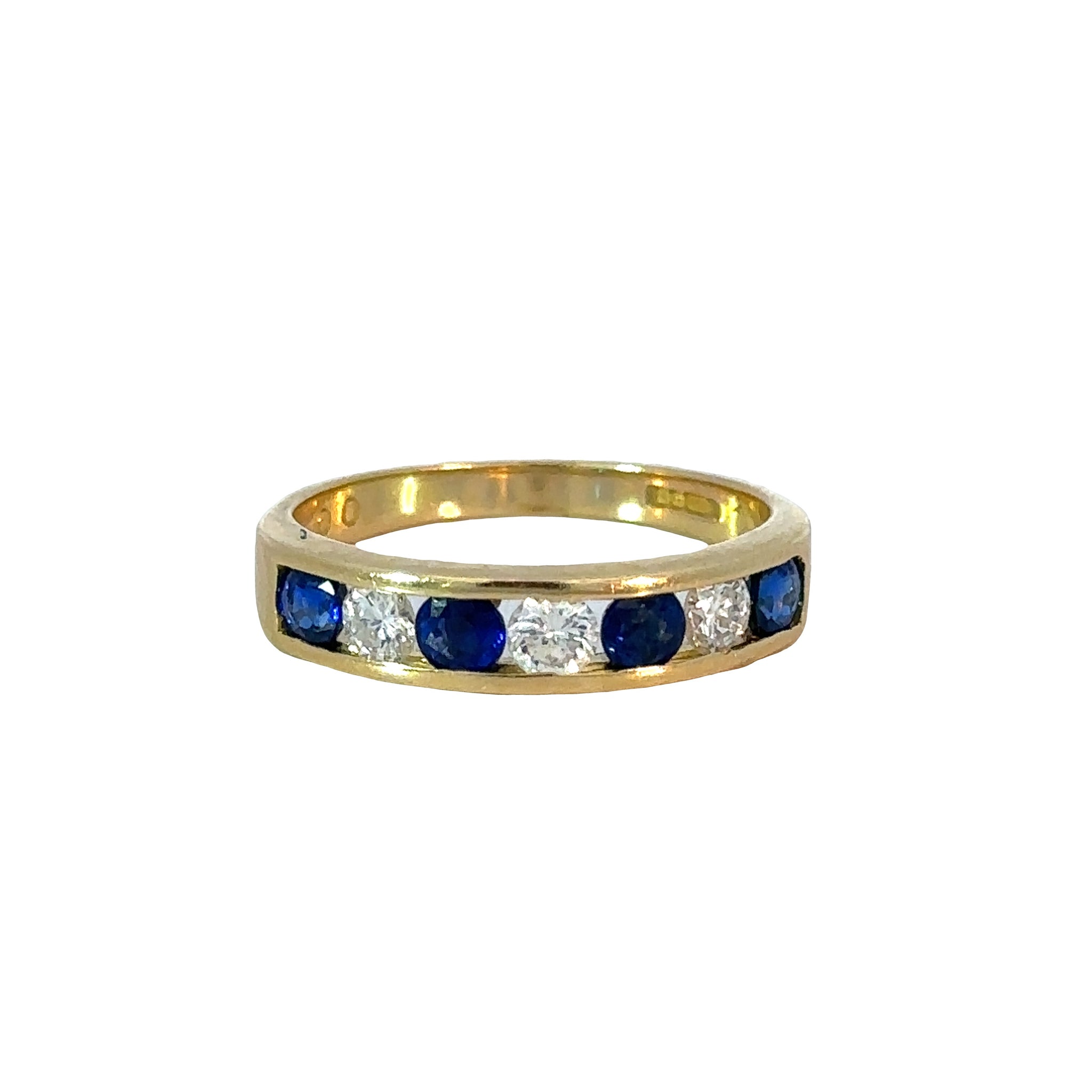 Sapphire Diamond Channel Set ring crafted in Sapphires and diamonds; a perfect combination. Set alternately in the smooth and flush channel setting of this 18ct yellow gold ring. Made in England. Hallmarked