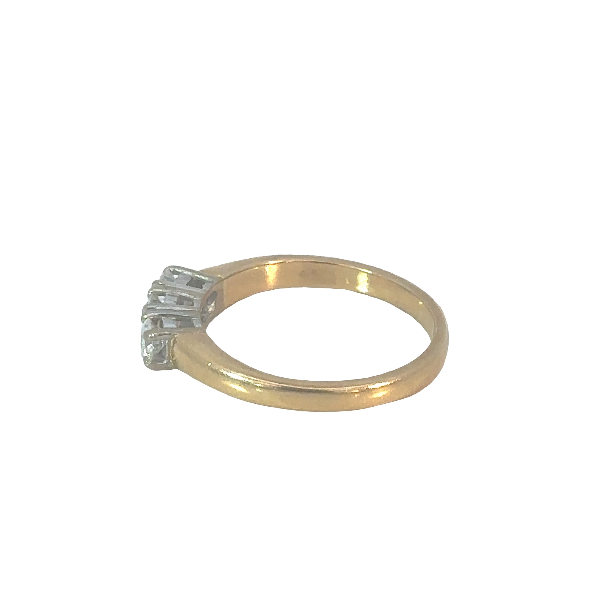 Three Stone Diamond Ring in 18ct Yellow Gold. In a 4-claw square setting in 18ct white gold. On a rounded plain tapered band in 18ct yellow gold.