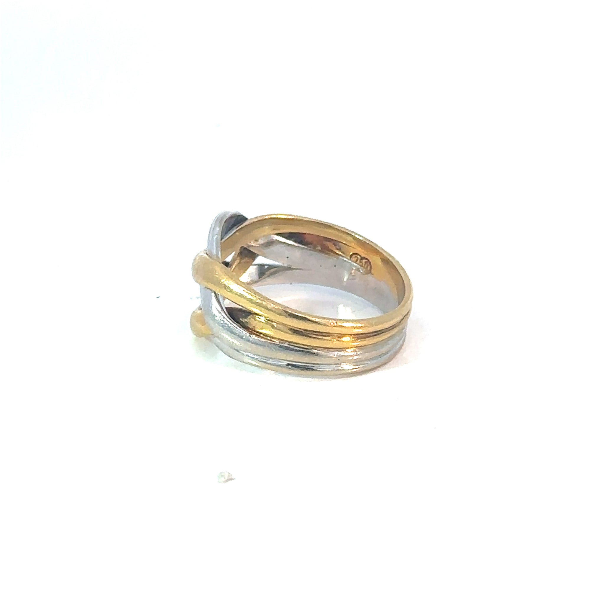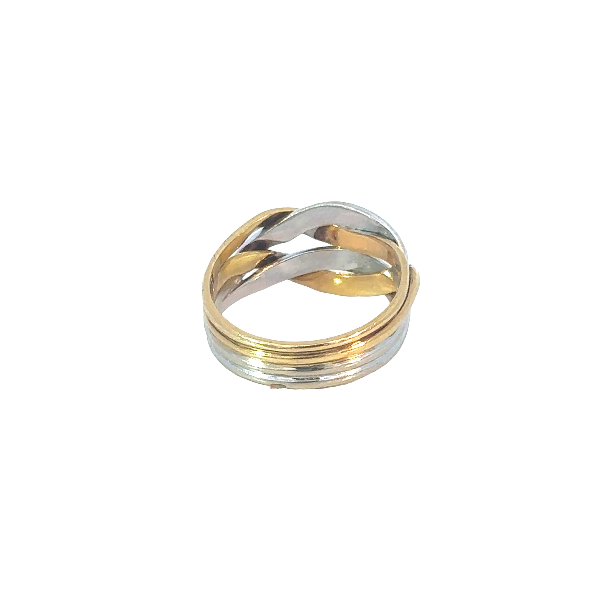 Two toned knot band set in 18ct Yellow and White Gold. Ring has four lines, two of Yellow gold and two White gold, intertwining with each other for the front half of the ring.