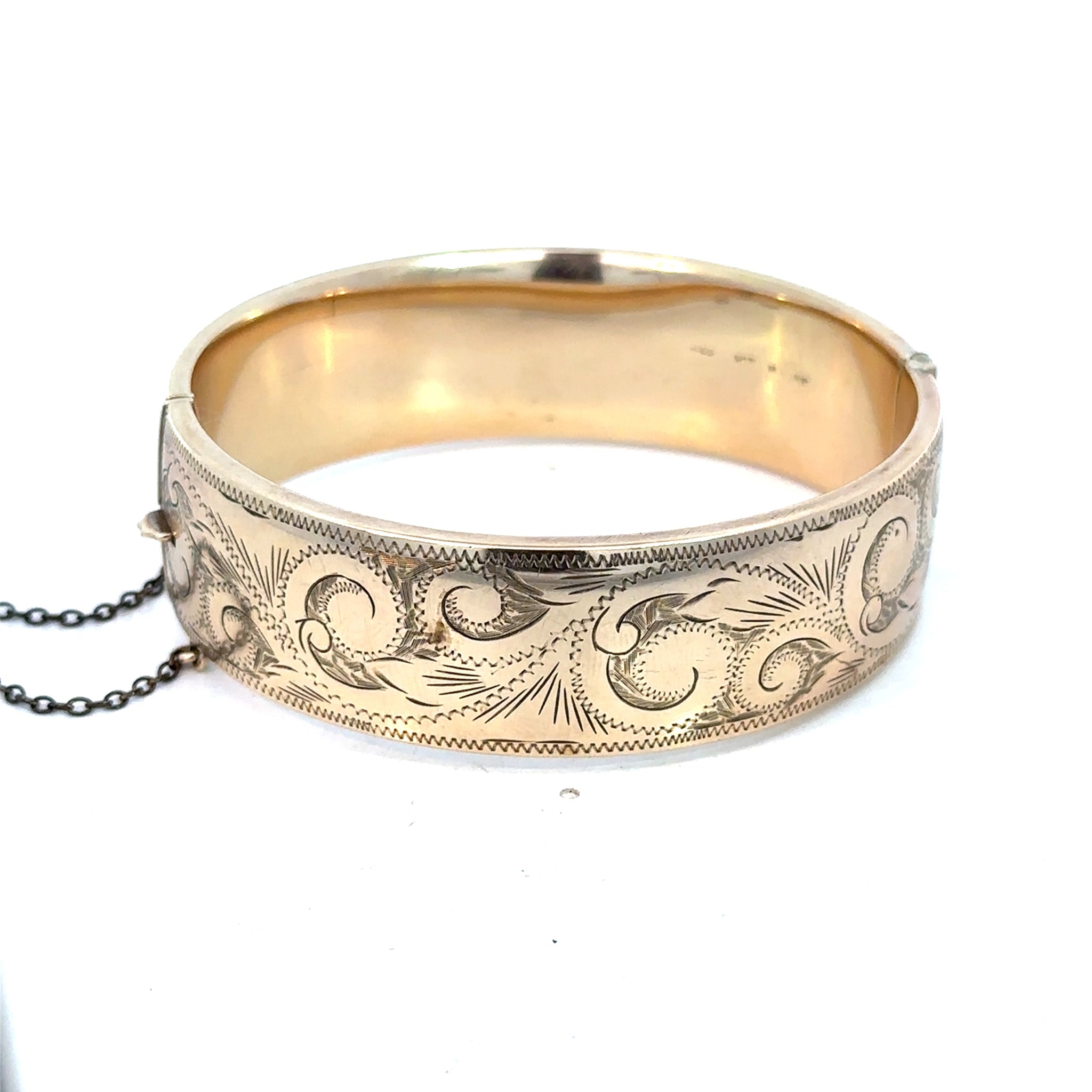 A lovel vintage, etched design bangle, made in 9ct yellow gold exterior bonded to a metal core. Oval Hinged, with a hidden gate clasp, and safety chain. 18mm thickness.