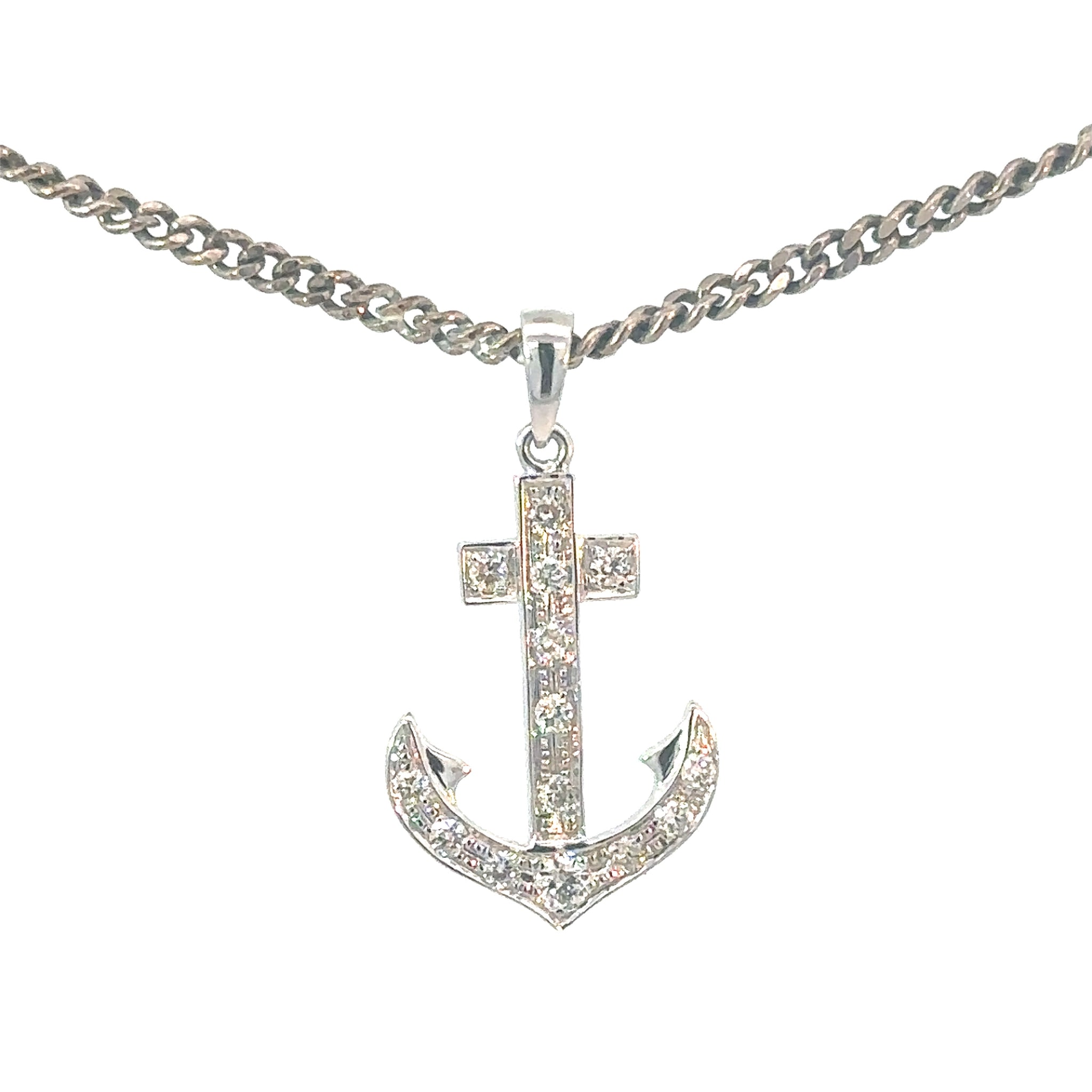 Diamond Anchor Pendant set in 9ct white gold. There are 13 round diamonds throughout the anchor. On a plain floating bail.
