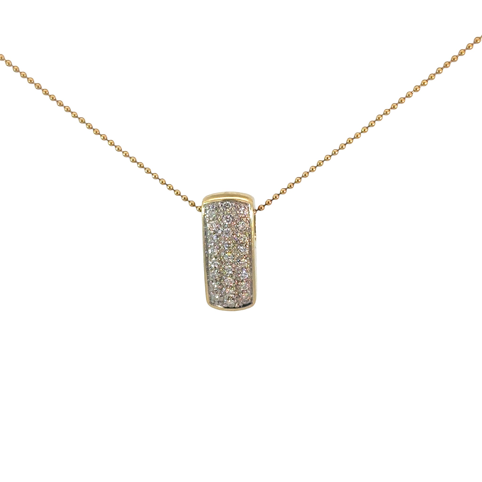 Diamond Drop Pendant Necklace, 14ct yellow gold. Diamonds are a pave set in three vertical rows down the front of the rectangular shaped pendant. The pendants is finished with an invisible bail. Rhodium plated front.