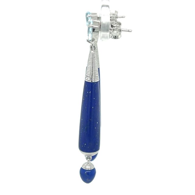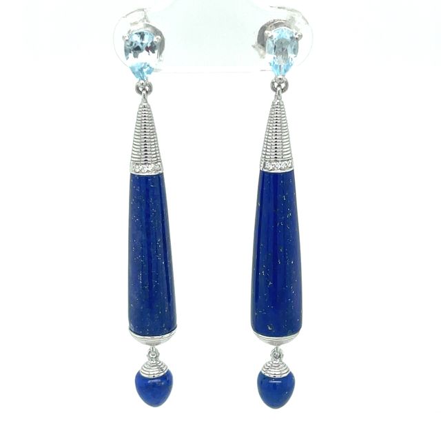 Lapis Lazuli Diamond drop Earrings with pear shaped blue Topaz. Stunning earrings in a 9ct White Gold. Post and butterfly scroll
