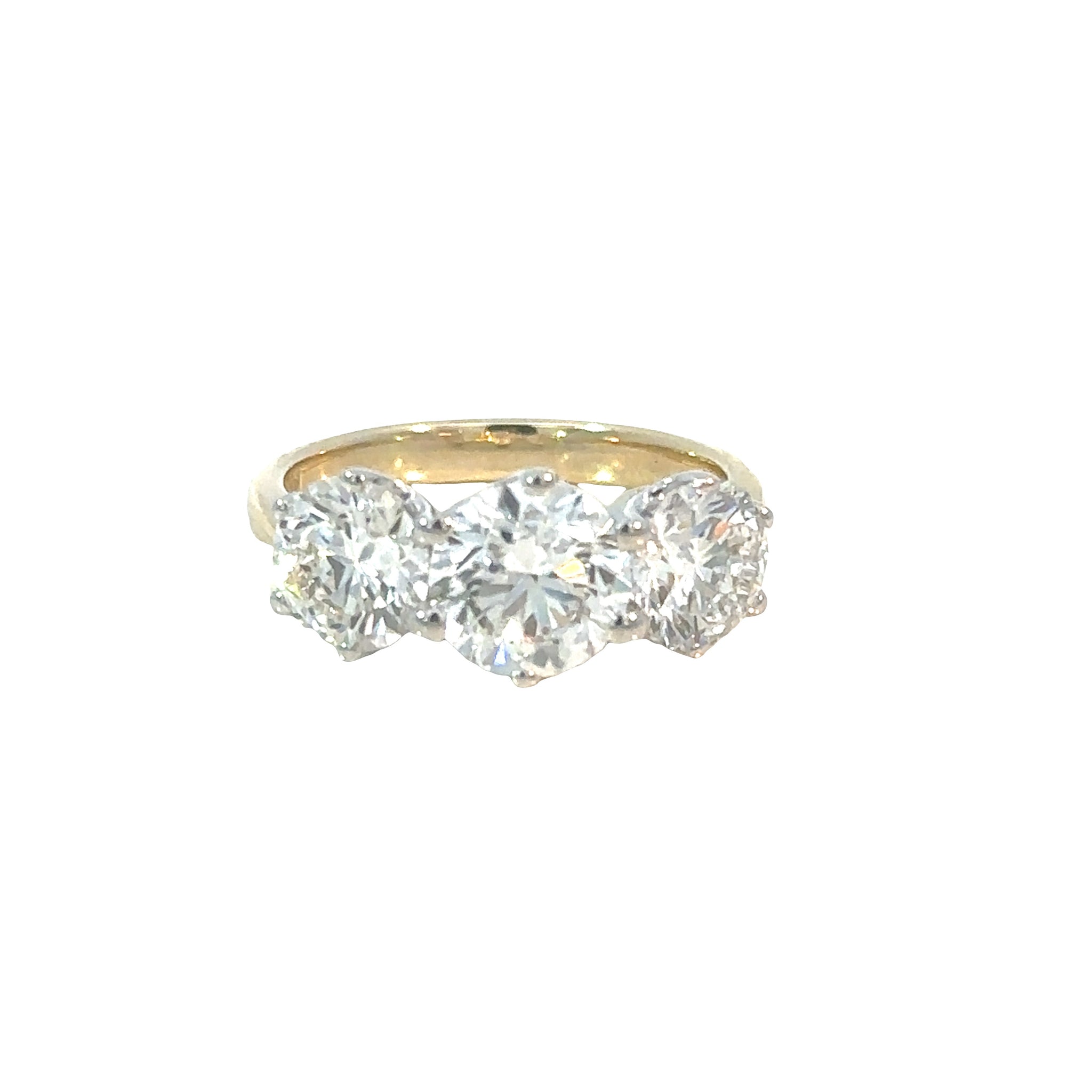 Lab Grown Diamond three stone ring in 9ct yellow and white gold - 4.12 carats. Designed for maximum brilliance, this lab-grown ring is set in a classic white gold setting. Crafted from conflict-free diamonds, this ring offer a luxurious aesthetic and lasting beauty. Not only are they ethical and eco-friendly, but they also offer all the fire and brilliance of mined diamonds, without the hefty price tag.