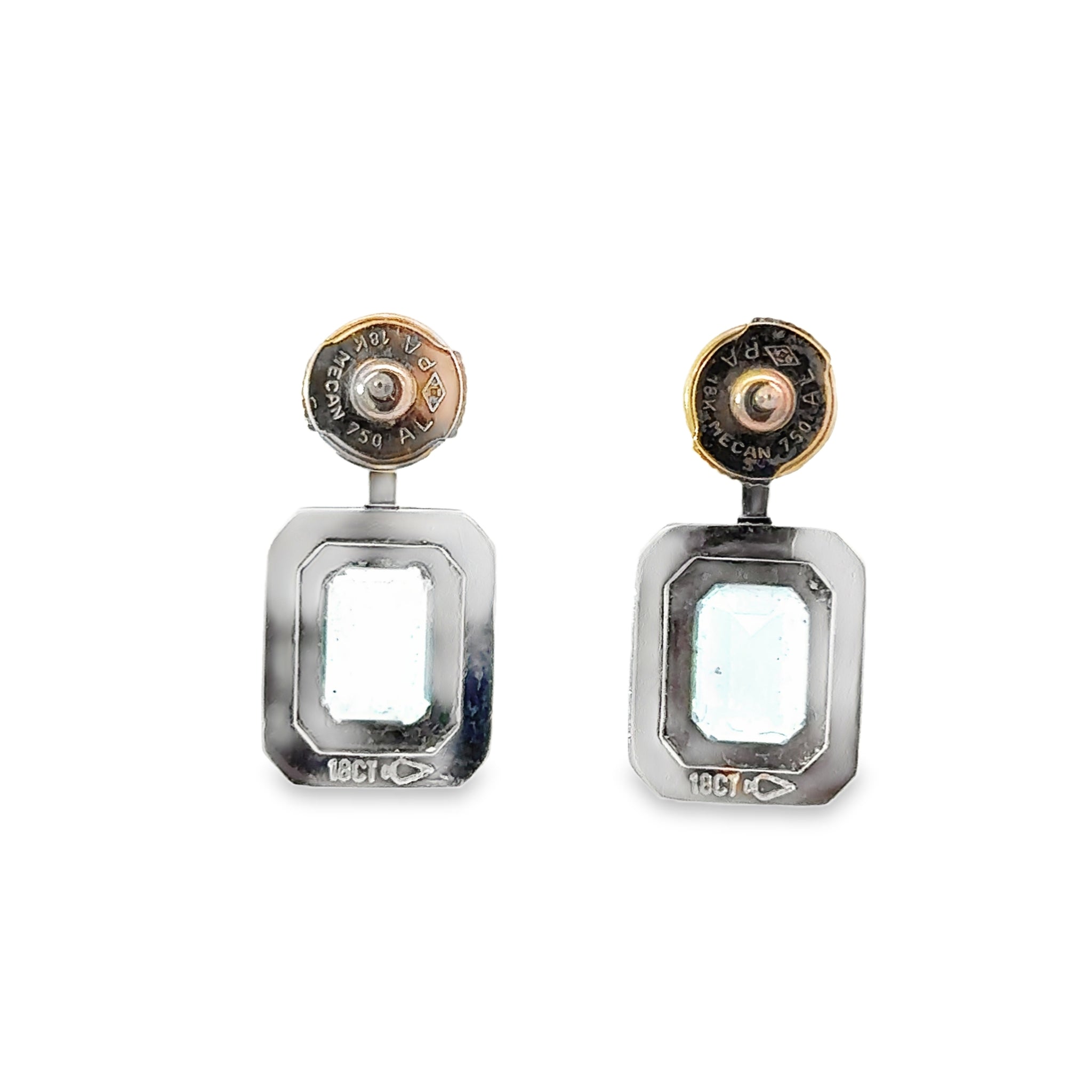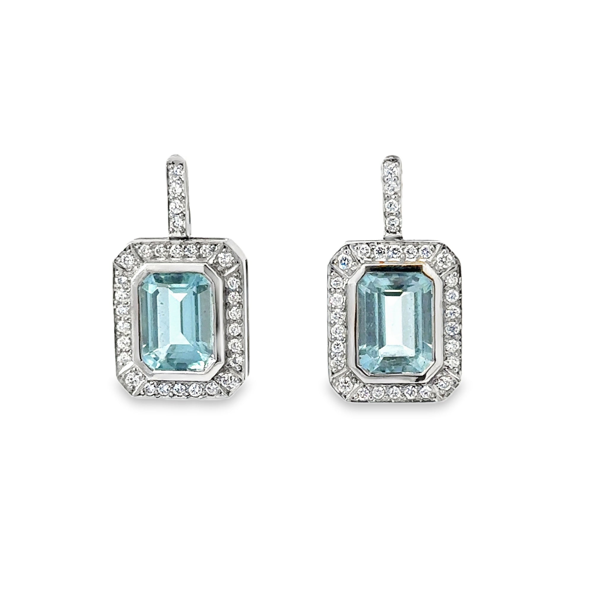 Aquamarine Diamond Earrings in 18ct White Gold. With post and spring loaded disc friction fittings. Each is an in line grain set vertical bar, joining a lower octagonal shaped cluster drop. Emerald cut aquamarines.