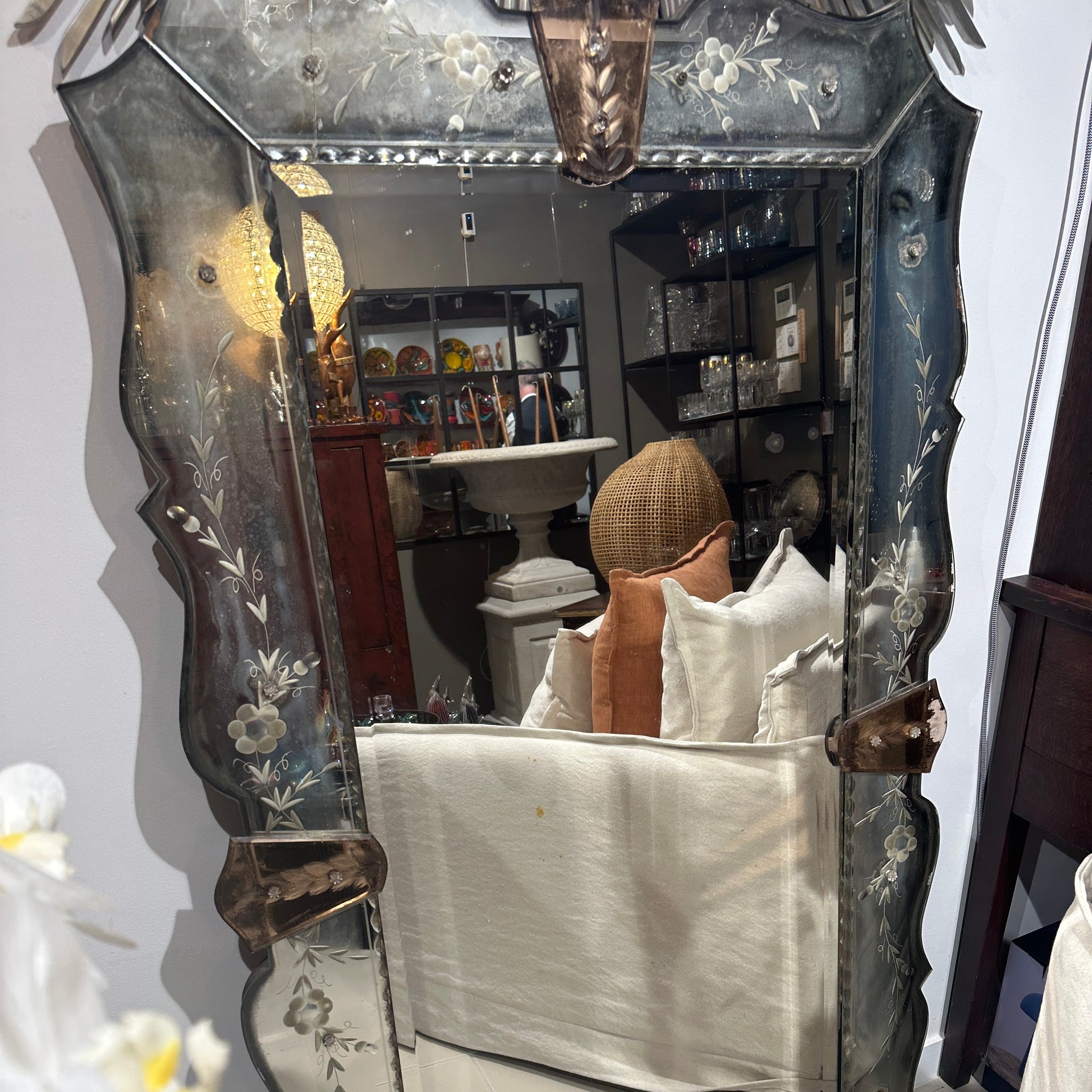 Antique Venetian Mirror. Aged mirror with small crystal embellishments. Have matching wall light sconces - sold separately.