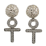 Pair of articulated drop earrings, each consists of two sections, detachable form each other for wear in various combinations. An ankh-style cross, 20.5 x 13.4 mm, pave set with 24 round brilliants. A shallow dome, 16.0 mm diameter, pave set with 39 x round brilliants.