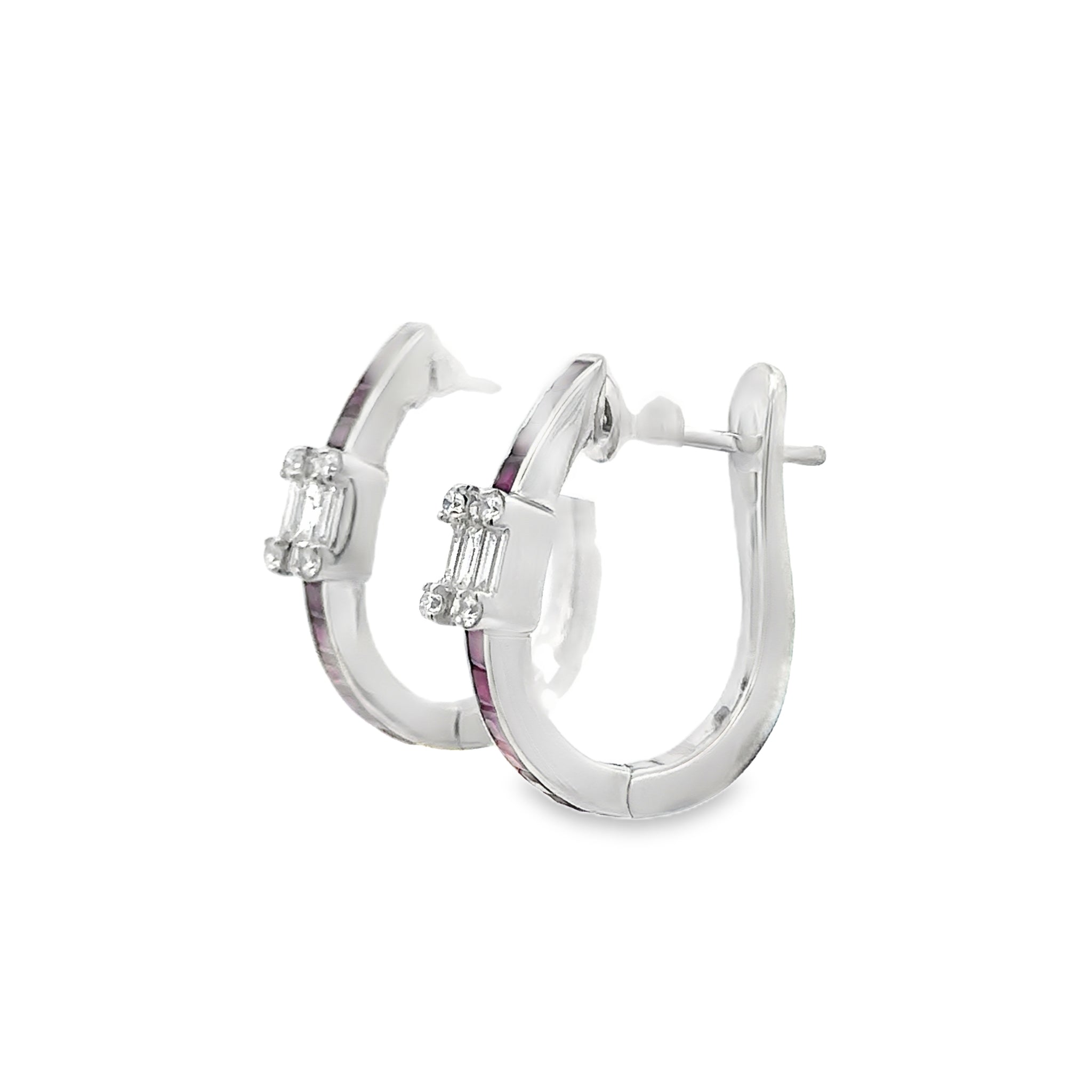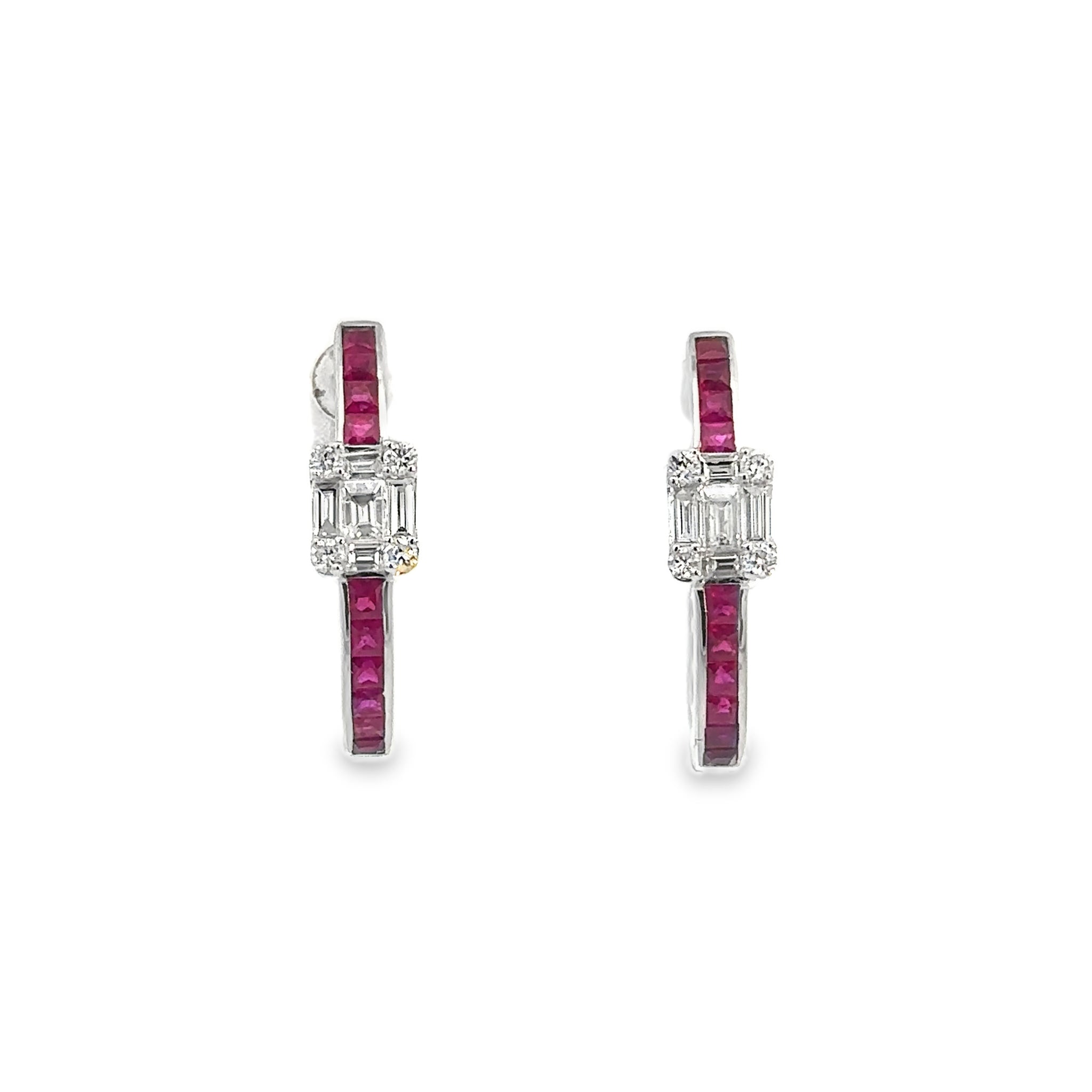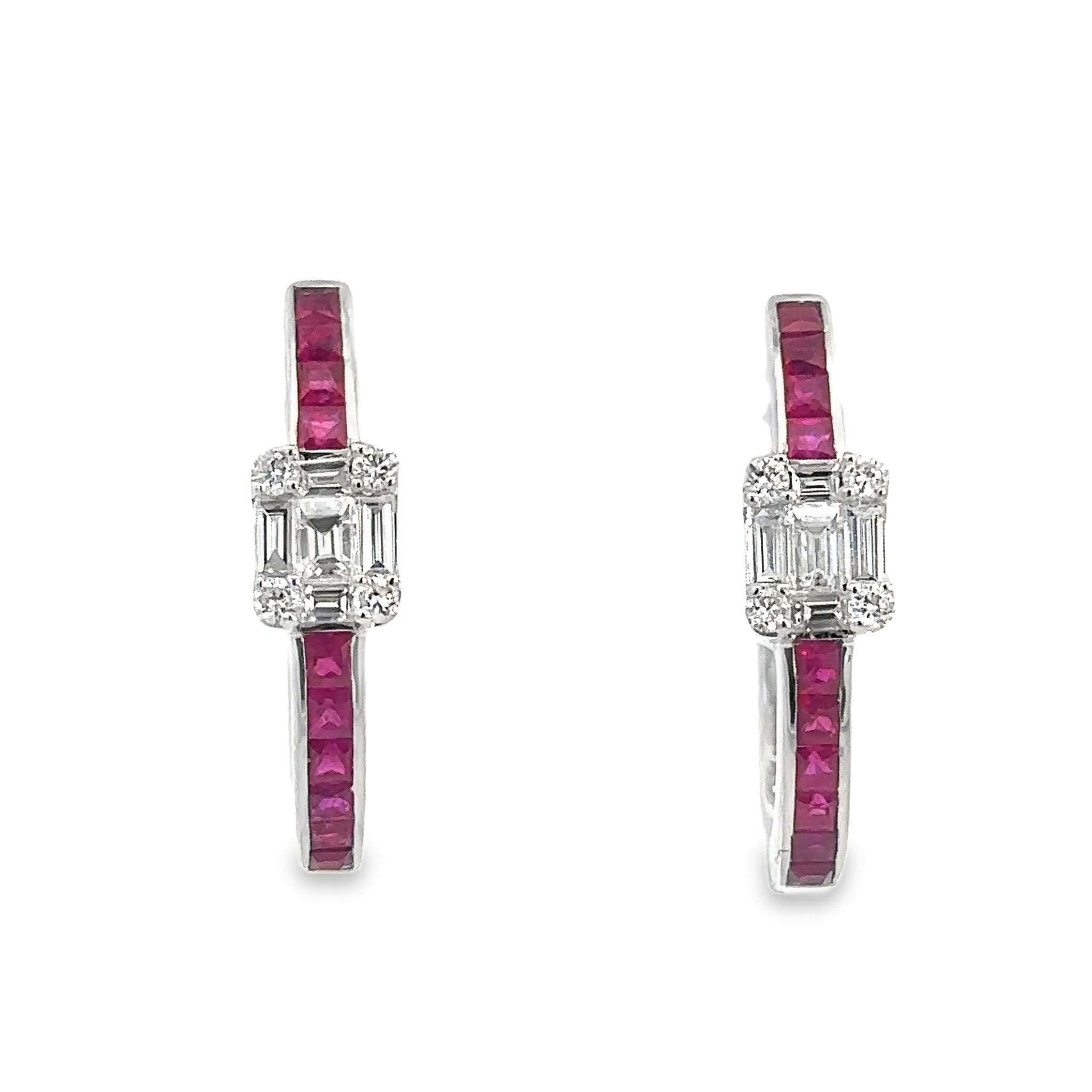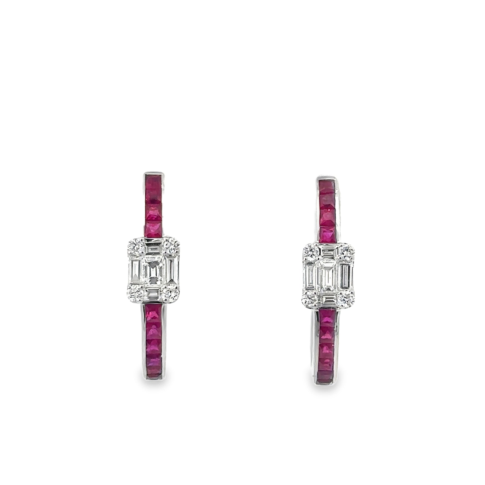 Ruby Diamond Hoop Earrings in 18ct White Gold. Princess cut rubies are channel set on huggies with beautiful baguette diamonds as a central feature. With latch backs with post.